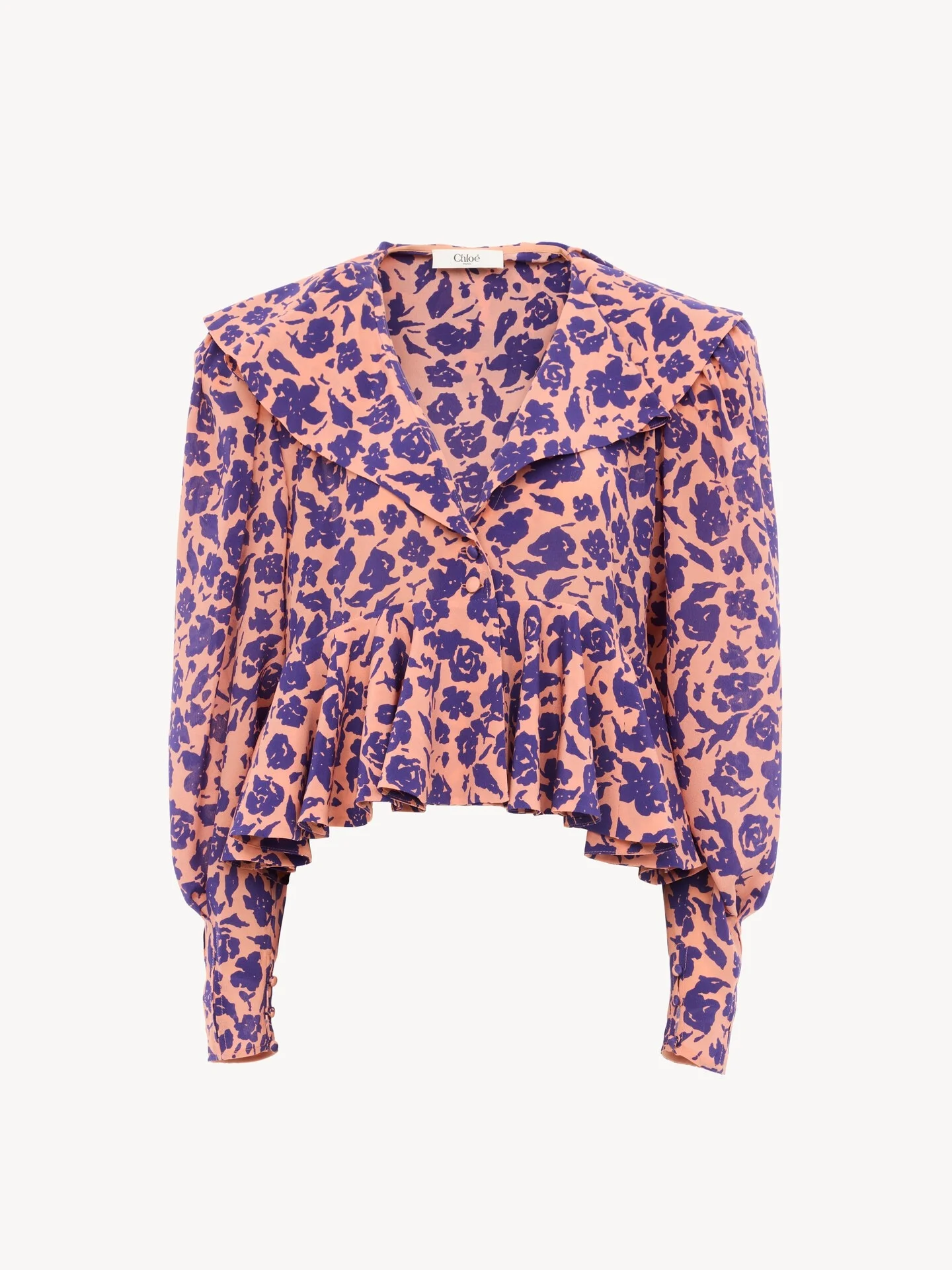 DESCRIPTION Cropped V-neck ruffle top in organic silk crepe de chine with a floral print, featuring a maxi collar and fabric-covered buttons. PRODUCT DETAILS V-neck ruffle top outer shell: 100% Silk Lining: 76% Acetate fiber, 24% Silk Fit: cropped, fluid - The model is 5'10" (178 cm) and wears a prototype in size 36 - Printed silk top - Fabric-covered buttons through front & at cuffs Organic silk manufacturing restricts the use of pesticides, insecticides or harsh chemicals and incorporates methods that respect biodiversity, improve soil quality and reduce water consumption. Color: Pink Item code: CH26SHT123079Q5 CARE INSTRUCTIONS To preserve the integrity of your garment, please refrain from washing, entrusting its care to professional cleaning services for optimal maintenance. This garment cannot withstand any bleaching agent. To maintain its shape, gently iron this garment at a maximum sole plate temperature of 110°C, taking care to avoid any harsh pressure while ironing. Entrust this garment to a specialist for mild cleaning with tetrachloroethylene and solvent F, ensuring its delicate nature is maintained with the most care. To best preserve its form and texture, please do not tumble dry this garment. To maintain its delicate nature, do not wet clean this garment. TRACEABILITY Better traceability is central to improving our materials as well as social and environmental practices. Finishing: Italy Weaving: China