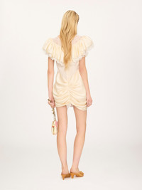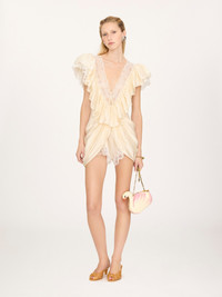 DESCRIPTION Short ruffled jumpsuit in washed silk satin with a deep V-neck, featuring lace trims, a draped silhouette and fabric-covered buttons. PRODUCT DETAILS Short jumpsuit outer shell: 100% Silk Main lining: 55% Cotton, 45% Polyamide Secondary lining: 100% Silk Main lacework: 100% Polyamide Secondary lacework: 90% Cotton, 10% Polyamide Sleeve lace: 50% Polyamide, 50% Cotton Fit: short, fluid - The model is 5'10" (178 cm) and wears a prototype in size 36 - V-neck jumpsuit - Fabric-covered buttons at front - Tie fastening at chest This product was made in collaboration with Akanjo, a certified WFTO supplier. Akanjo is a social enterprise located in Madagascar that places equal pay and employees' health & wellbeing at the core of their priorities. A long-standing partner of Chloe for 15 years, Akanjo is also committed to training and promoting craftsmanship. Color: Eden White Item code: CH26USL06008112 CARE INSTRUCTIONS To preserve the integrity of your garment, please refrain from washing, entrusting its care to professional cleaning services for optimal maintenance. This garment cannot withstand any bleaching agent. To maintain its shape, gently iron this garment at a maximum sole plate temperature of 110°C, taking care to avoid any harsh pressure while ironing. Entrust this garment to a specialist for mild cleaning with tetrachloroethylene and solvent F, ensuring its delicate nature is maintained with the most care. To best preserve its form and texture, please do not tumble dry this garment. To maintain its delicate nature, do not wet clean this garment. TRACEABILITY Better traceability is central to improving our materials as well as social and environmental practices. Dyeing: Italy Finishing: Italy Weaving: China