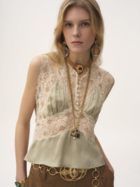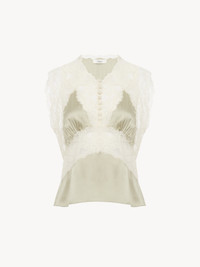 V-neck top in silk satin with contrast lace inserts and fabric-covered buttons. PRODUCT DETAILS V-neck top outer shell: 100% Silk Lacework: 100% Polyamide Fit: straight - The model is 5'10" (178 cm) and wears a prototype in size 36 - Lace-trimmed silk top - Fabric-covered buttons at front Color: Clear Green Item code: CH25AHT29132337
