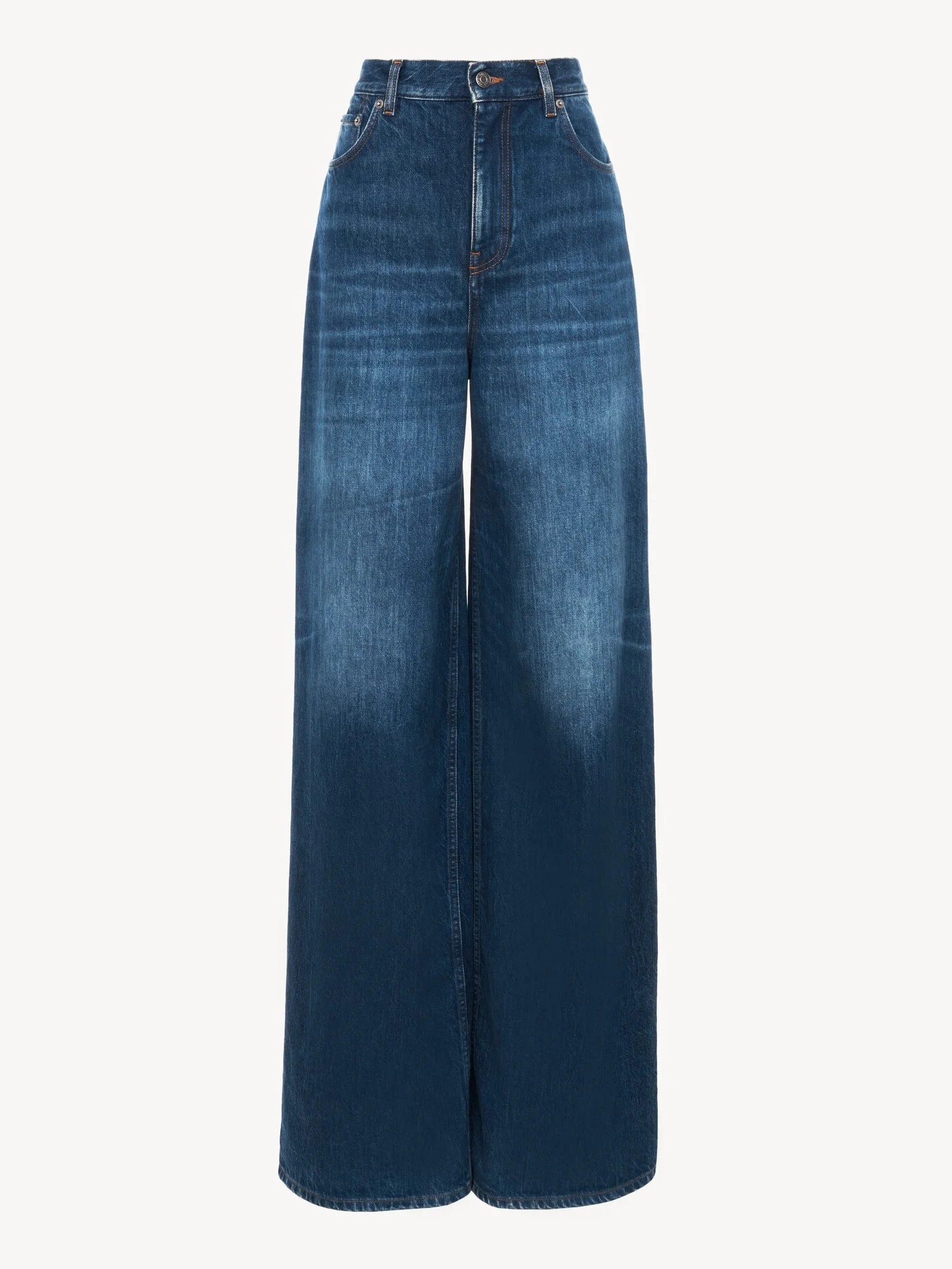 Low-waisted, wide-leg jeans in waterless organic cotton indigo denim with a distressed hem. PRODUCT DETAILS Wide-leg jeans outer shell: 100% Cotton Patch: 100% Calfskin Pocket lining: 65% Polyester, 35% Cotton Fit: wide-leg, low waist - The model is 5'10" (178 cm) and wears a prototype in size 26 - Low-rise jeans - Front zipper & Chloe-engraved button fastening - Classic 5-pocket design - Belt loops - Half-moon leather Chloe patch at back Care: gentle wash 90°F (30°C) An organic cotton farming system sustains the health of soils, ecosystems and people by eliminating the use of toxic and persistent organic pollutants and increasing water conservation. This product was made with a waterless process, using up to 30% less water than standard manufacturing processes. Color: Night Blue Item code: CH25SDP12150402