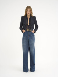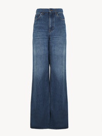 Wide-leg palazzo jeans in soft organic cotton denim with a vintage wash. PRODUCT DETAILS Wide-leg jeans outer shell: 100% Cotton Pocket lining: 65% Polyester, 35% Cotton Care: gentle wash 85°F (30°C) Fit: high-rise, wide-leg - The model is 5'10" (178 cm) and wears a prototype in size 26 - High-rise jeans - Front zipper & Chloé Jeans Paris-engraved button fastening - Classic 5-pocket design - Belt loops - Chloé half-moon tab at back An organic cotton farming system sustains the health of soils, ecosystems and people by eliminating the use of toxic and persistent organic pollutants and increasing water conservation. Color: Night Blue Item code: CHC24ADP02150402