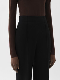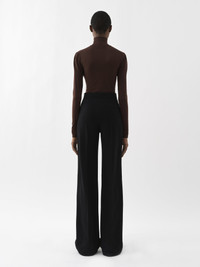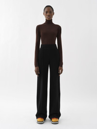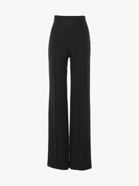 Made from gauzy recycled cashmere for a city-inspired flou silhouette, these wide-leg wool trousers for women combine a high-rise, floor-length cut with masculine front and back creases. The effortless slip-on design ensures day-long comfort. PRODUCT DETAILS Wide-leg wool trousers for women outer shell: 50% Virgin wool, 50% Cashmere Inner: 100% Silk Care: dry cleaning only Fit: flared, high waist, floor-length - The model is 5'10'' (178 cm) and wears a prototype in size 36 - High-rise pants for women - Slips on Recycled cashmere keeps its natural softness and insulating power, but with a reduced environmental impact. Using recycled cashmere enables us to extend the lifespan of a fiber that has already been produced. Color: Black Item code: CHC22WPA46069001