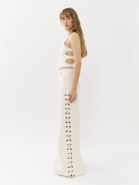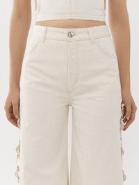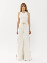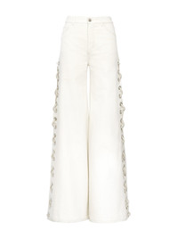 These wide-leg rave jeans are crafted from an "off-white" wash recycled cotton and hemp blend. The season's signature hand-applied metallic eyelets and lacing run down the sides for crafty detail. PRODUCT DETAILS Rave jeans main material: 87% Cotton, 13% Hemp Care: gentle wash 85°F (30°C), dry flat Fit: wide-leg - The model is 5’10” (178 cm) and wears a prototype in size 36 - Flare jeans - Front button & zipper fastening - Classic 5-pocket design This denim is a blend of recycled cotton and natural fibers (hemp or linen), both considered lower-impact materials. Recycled cotton keeps its natural softness and inherent quality, with a reduced environmental impact. Using recycled cotton enables us to extend the lifespan of a fiber that has already been produced. Linen, hemp and ramie cultivations emit less greenhouse gases and require less water compared to other conventional natural fibers, which is why they are considered lower-impact materials by their nature. Color: Iconic Milk Item code: CHC23UDP02152107