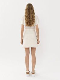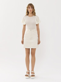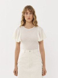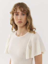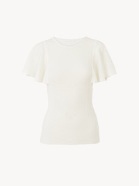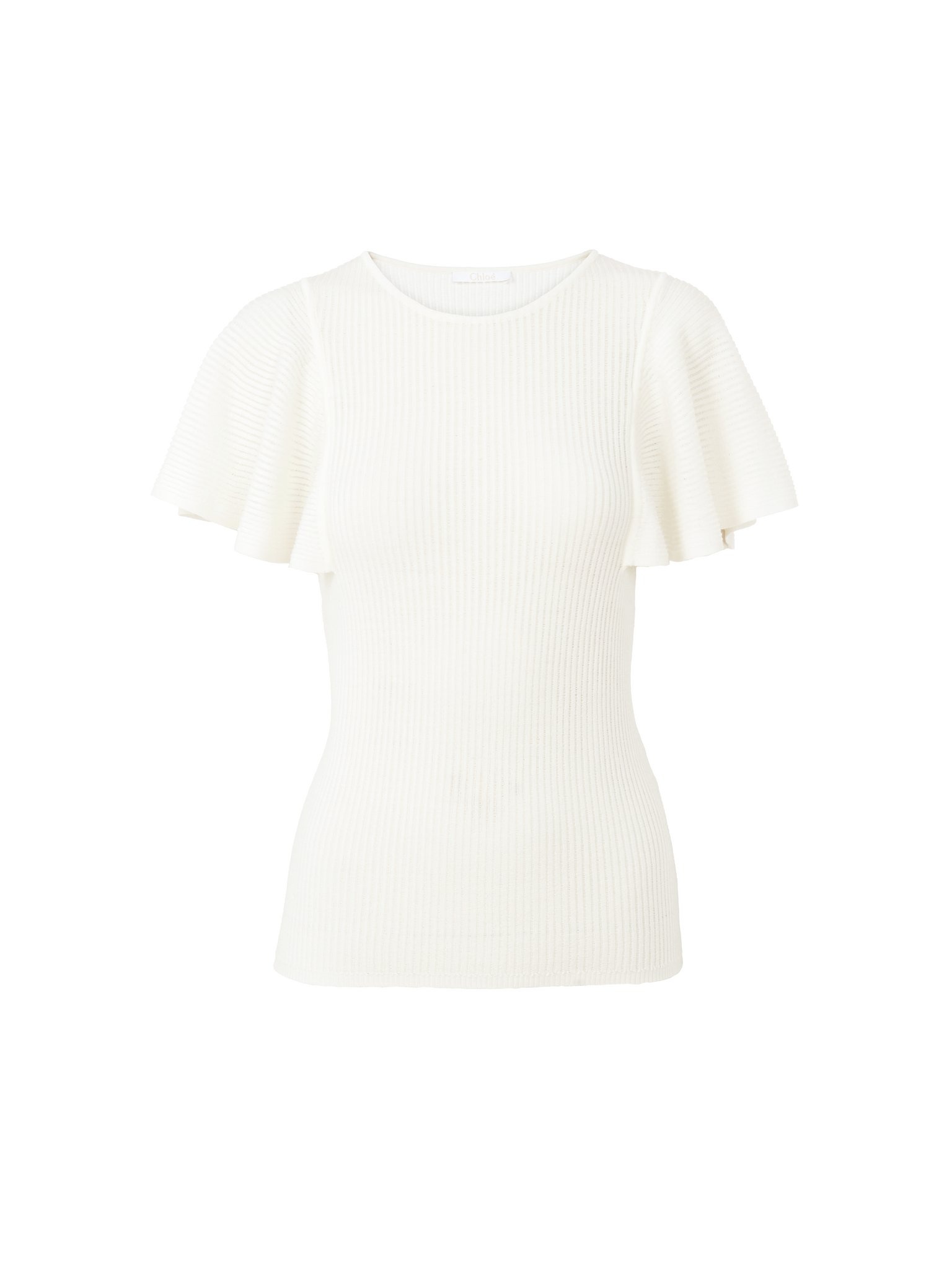 Crafted from a lower-impact wool rib knit with subtle ladder stitches, this wing-sleeve top is a fine, sheer piece detailed with the Maison's signature flounces. PRODUCT DETAILS Wing-sleeve top main material: 100% Wool Ribbing: 88% Wool, 8% Polyamide, 4% Elastane Care: dry cleaning only Fit: short sleeves, fitted - The model is 5’10” (178 cm) and wears a prototype in size S - Knit blouse - Slips on The wool used in this product comes from a farm that respects animal welfare, maintains soil health, protects biodiversity and promotes native species. Color: Iconic Milk Item code: CHC23UMH17662107
