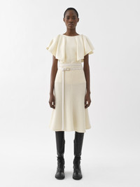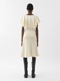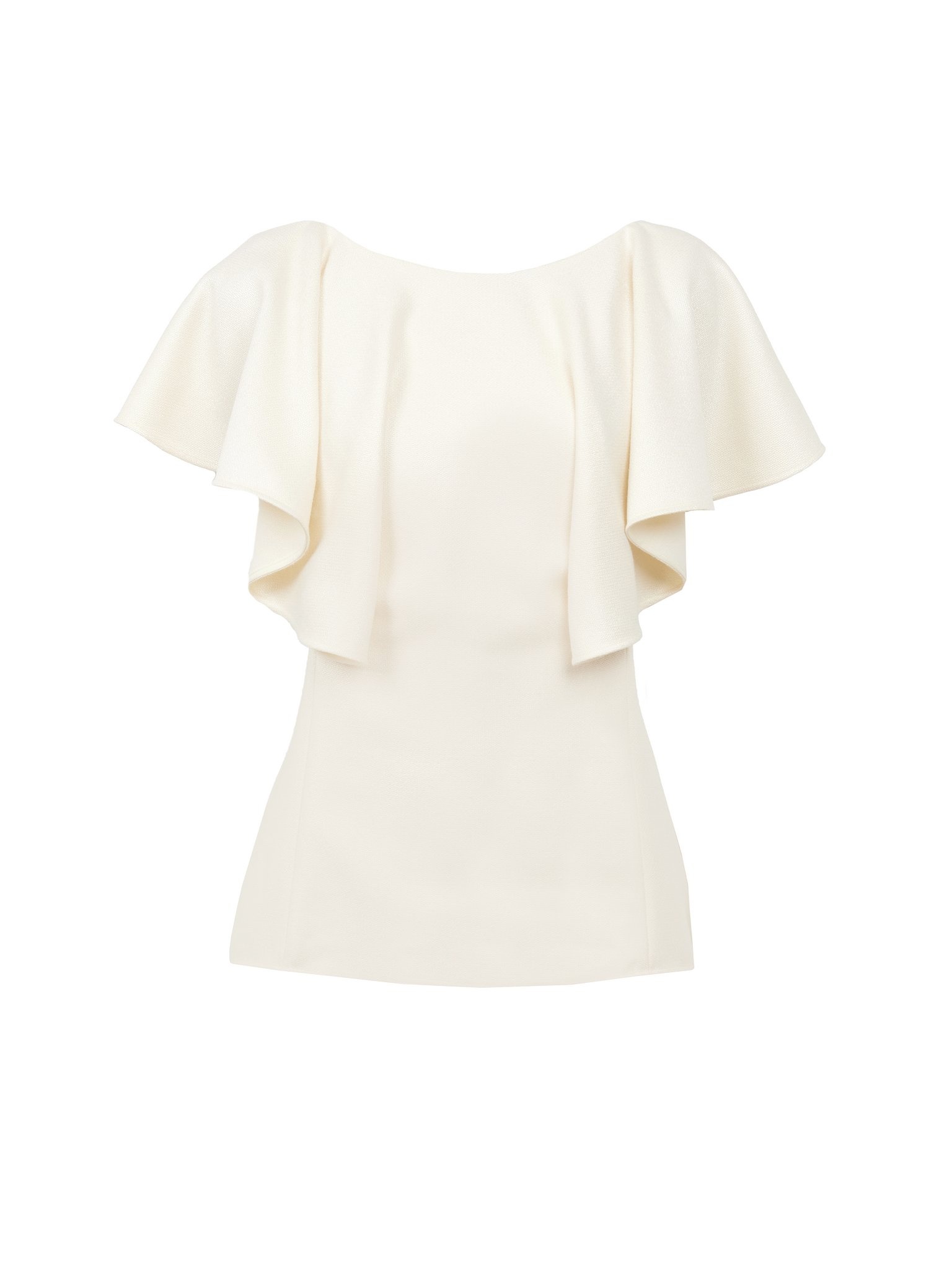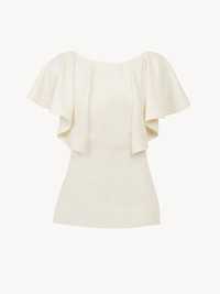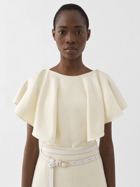 Showcasing a sculptural, tailored flou silhouette, this wing-sleeve ruffle top is crafted from an armoured silk wool with a delicate satin finish. The fitted design highlights the collarbone and flouncy sleeves for a confident feminine allure. Wear it with the matching mid-length skirt for the full look. PRODUCT DETAILS Wing-sleeve ruffle top outer shell: 61% Silk, 39% Wool Inner: 100% Silk Care: dry cleaning only Fit: fitted, sleeveless - The model is 5'10'' (178 cm) and wears a prototype in size 36 - Fitted silk blouse - Concealed back zipper & hook Color: Coconut Milk Item code: CHC22WHT04065103