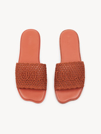 DESCRIPTION These crochet-effect Chloe Soleil slides feature a distinctive wavy sole. The upper is embroidered with the Chloe Iconic logo. PRODUCT DETAILS Flat slides Upper: viscose Inner sole: lambskin Main lining: lambskin Sole: cowhide Fit true to size, European sizing - Slip-on Color: Terracotta Red Item code: CH25A12LRG841 CARE INSTRUCTIONS Your Chloe shoes have been carefully crafted by master artisans. The original textile was carefully selected for its natural beauty. Its characteristics provide comfort and durability.To preserve their beauty and original appearance, we recommend that you take special care of your Chloe shoes.Store them away from direct sunlight, heat and rain. Your Chloe shoes should not be worn or kept for long periods in damp environments.To prevent the colour from bleeding, take care to avoid any prolonged rubbing against or contact with other materials in a contrasting colour to your Chloe shoes.Should your shoes get wet, gently dab them dry with a soft, dry cloth — preferably a neutral-coloured one.Your shoes can be carefully cleaned with a dry, soft cloth — preferably a neutral-coloured one.Fill your shoes with tissue paper to help them maintain their original shape, then place them in the two protective covers provided. Store them in a cool, dry, well-aired place.
