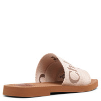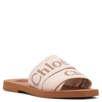 Beige linen slides from Chloe. The Woody slides are made of different-sized ribbons with a contrasting Chloe logo across the top, along with the designer's "O" signature on the inner sole. It is complete with ecru stitches on the rubber sole. - Rubber sole - True to size - Made in Italy Product Code: CHC19U18826Y