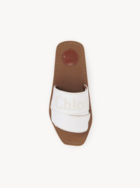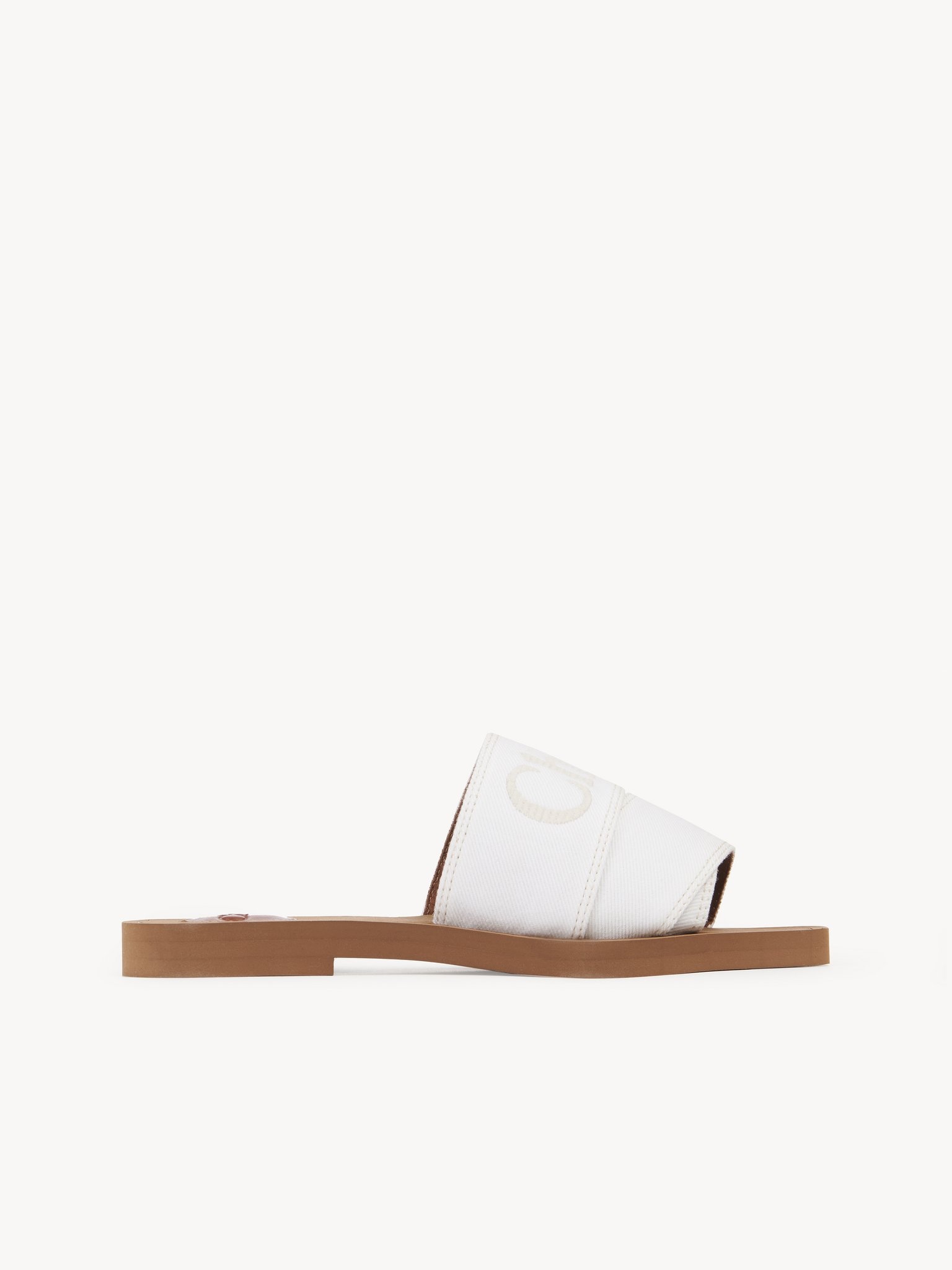 Revisited in white denim for an easy-wearing summer attitude, this Woody flat mule reveals an interplay of different-sized ribbons finished with the signature embroidered Chloé logo. Together, they form a large upper for a comfortable fit. The easy slip-on design makes this flat a summer essential. The Maison's "O" signature adorns the inner sole, while iconic ecru stitches lend an equestrian mood to the recycled rubber sole for a playful twist. PRODUCT DETAILS Flat mule - Upper: cotton - Inner sole: 95% ethylene vinyl acetate, 5% cowhide - Sole: ethylene vinyl acetate Fit true to size, European sizing - Flat - Slip-on mule Recycled cotton keeps its natural softness and inherent quality, with a reduced environmental impact. Using recycled cotton enables us to extend the lifespan of a fiber that has already been produced. Color: Snow White Item code: CHC23A188FB104
