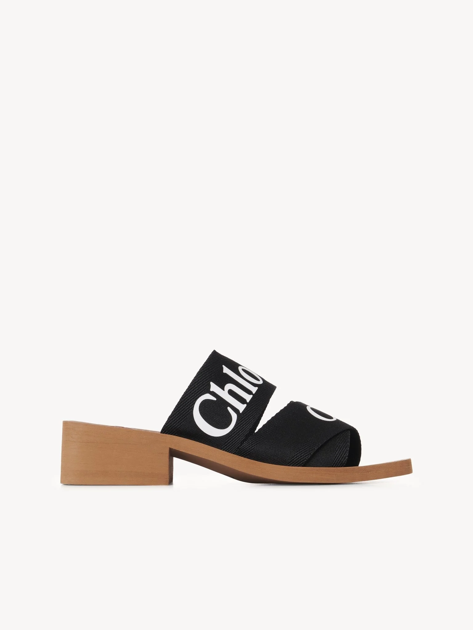 New to the Woody family, this high-heel mule is an elevated version of the iconic Woody slide. The low heel combines comfort and elegance, while the easy slip-on design makes it a summer essential. An interplay of different-sized linen ribbons form a sturdy upper with the Chloé logo in striking contrast. The Maison's "O" signature adorns the inner sole, while iconic ecru stitches lend an equestrian mood to the recycled rubber sole for a playful twist. PRODUCT DETAILS High-heel mule height: 1.8” (4.5 cm) - Heel: ethylene vinyl acetate - Inner sole: 95% ethylene vinyl acetate, 5% calfskin - Upper: 100% linen - Sole: ethylene vinyl acetate - Lining: 90% linen, 10% polyester Fit true to size, European fit - Slip-on Color: black Item code: CHC22U550Z3001