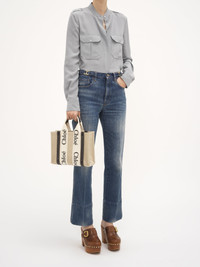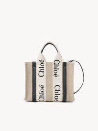 Crafted from lower-impact linen canvas detailed with shiny calfskin strips, this small Woody tote bag is a soft day-to-evening bag with a long, removable strap in addition to the top handles. The roomy inside compartment is unlined and includes a practical flat pocket in leather for an elevated touch. Carry this versatile small purse on the arm, shoulder or cross-body. All about Woody... The Woody bag's sharp, modern lines are emphasized by the contrasting vertical leather strips and the signature Chloé logo ribbon carried over from the Maison's Woody mule. PRODUCT DETAILS Tote bag in linen canvas & shiny calfskin with linen Woody ribbon Carry: shoulder, arm & cross-body - 2 short handles - Removable & adjustable long strap - 1 spacious main compartment - 1 internal flat pocket Comes with a dust bag - Width: 10.4" (26.5 cm) - Height: 7.9" (20 cm) - Depth: 3.1" (8 cm) - Handle drop: 4.3" (11 cm) - Strap drop: 20.5" (52 cm) This small purse is made from linen. In an effort to limit its environmental impact and have a positive influence on society, Chloé is accelerating its transition to more responsible sourcing. This progress is most notably reflected in the introduction of linen—an inherently lower-impact material—to the collection. Respect care instructions on the leaflet. By purchasing this product, you are supporting sustainable leather manufacturing through the Leather Working Group. Color: White & Blue Item code: CHC22AS397I2691J