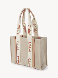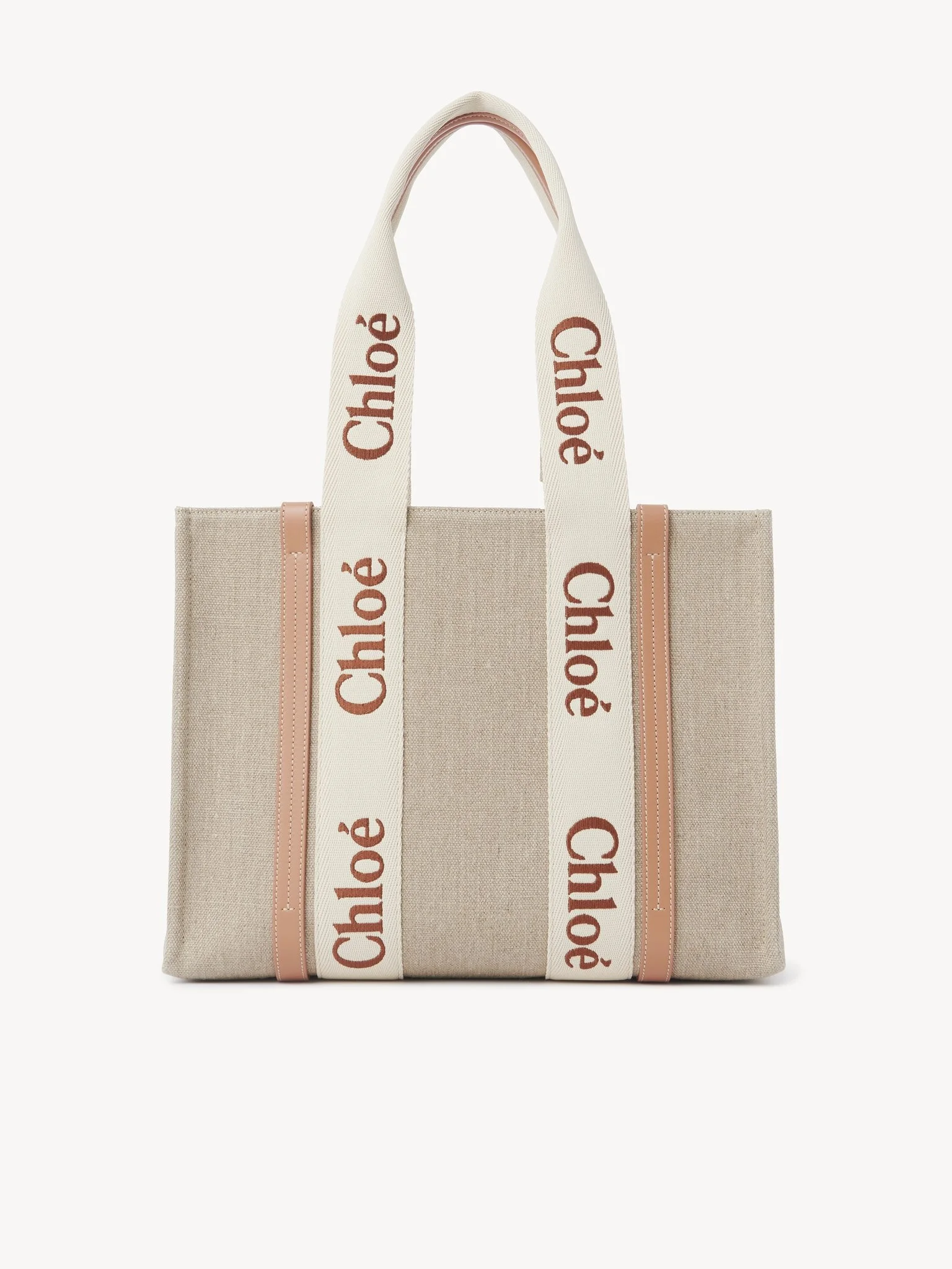 This Woody tote bag is crafted from linen canvas, elevated by contrasting vertical strips in shiny calfskin and signature canvas ribbons embroidered with the Chloe logo. Carry on the shoulder or in the hand with the double handles. PRODUCT DETAILS Woody tote bag in linen canvas, calfskin & webbing with Chloe logo embroidery Main material: Linen Secondary material: Calfskin Main lining: 68% Linen, 32% Cotton Trim: Polyester Carry: Hand & shoulder - 2 long handles - 1 spacious main compartment - 1 internal flat pocket Comes with a dust bag - Width: 14.6" (37 cm) - Height: 10.2" (26 cm) - Depth: 4.7" (12 cm) - Strap drop: 10.6" (27 cm) This tote bag is woven from natural fiber in collaboration with Mifuko, which empowers its artisans in Kenya through fair pay and less dependence on unpredictable farming as a source of income. Each basket is a unique handmade piece that weaves together traditional Kenyan handcraft and the story of a strong, independent woman whose signature you will find on the label. Linen, hemp and ramie cultivations emit less greenhouse gases and require less water compared to other conventional natural fibers, which is why they are considered lower-impact materials by nature. To make this product, Chloe worked with Leather Working Group (LWG) certified leather manufacturers. LWG certifies tanneries based on their water and energy usage, management of chemicals, solid waste, and wastewater. Color: Wooden Orange Item code: CHC23AS383L17847