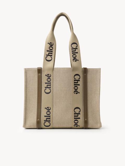 DESCRIPTION This Woody tote bag is crafted from linen canvas, elevated by contrasting vertical strips in shiny calfskin and signature canvas ribbons embroidered with the Chloe logo. Carry on the shoulder or in the hand with the double handles. PRODUCT DETAILS Woody tote bag in linen canvas, calfskin & webbing with Chloe logo embroidery Main material: Linen Secondary material: Calfskin Main lining: 68% Linen, 32% Cotton Trim: Polyester Carry: Hand & shoulder - 2 long handles - 1 spacious main compartment - 1 internal flat pocket Comes with a dust bag - Width: 14.6" (37 cm) - Height: 10.2" (26 cm) - Depth: 4.7" (12 cm) - Strap drop: 10.6" (27 cm) Linen, hemp and ramie cultivations emit less greenhouse gases and require less water compared to other conventional natural fibers, which is why they are considered lower-impact materials by nature. To make this product, Chloe worked with Leather Working Group (LWG) certified leather manufacturers. LWG certifies tanneries based on their water and energy usage, management of chemicals, solid waste, and wastewater. Color: Dusty Tan Item code: CHC23AS383L1725S CARE INSTRUCTIONS To preserve the integrity of your garment, please refrain from washing, entrusting its care to professional cleaning services for optimal maintenance. In order to protect this article, we recommend that you: avoid overloading your bag avoid rubbing against abrasive materials shield it from humidity, light and heat avoid contact with liquids and greasy substances (makeup, cream) store your bag carefully in its dustcover when not in use avoid rubbing against color-contrasting clothes or materials to remove a water stain, gently soak up liquid by dabbing it with a white cloth should a scratch occur on the leather, you can gently massage it with the same type of cloth for all other issues, please contact the Chloe after-sales service or a specialist. TRACEABILITY Better traceability is central to improving our materials as well as social and environmental practices. Dyeing: Italy Finishing: Italy Weaving: Italy Tanning: Italy