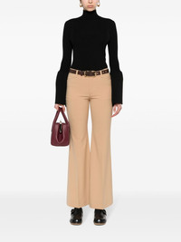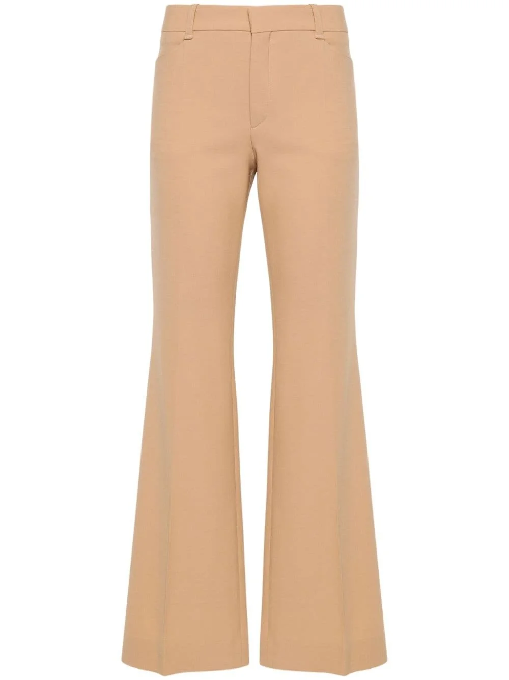 wool-blend flared trousers Highlights - Beige - Stretch-wool - Interwoven design - Pressed crease - Dart detailing to the rear - Belt loops - Mid-rise - Slip pockets to the sides - Two rear welt pockets - Concealed front button, hook and zip fastening - Flared hem - Unlined Made in Italy Composition Lining: Ramie 100% Outer: Virgin Wool 95%, Elastane 5% Washing instructions Dry Clean Only
