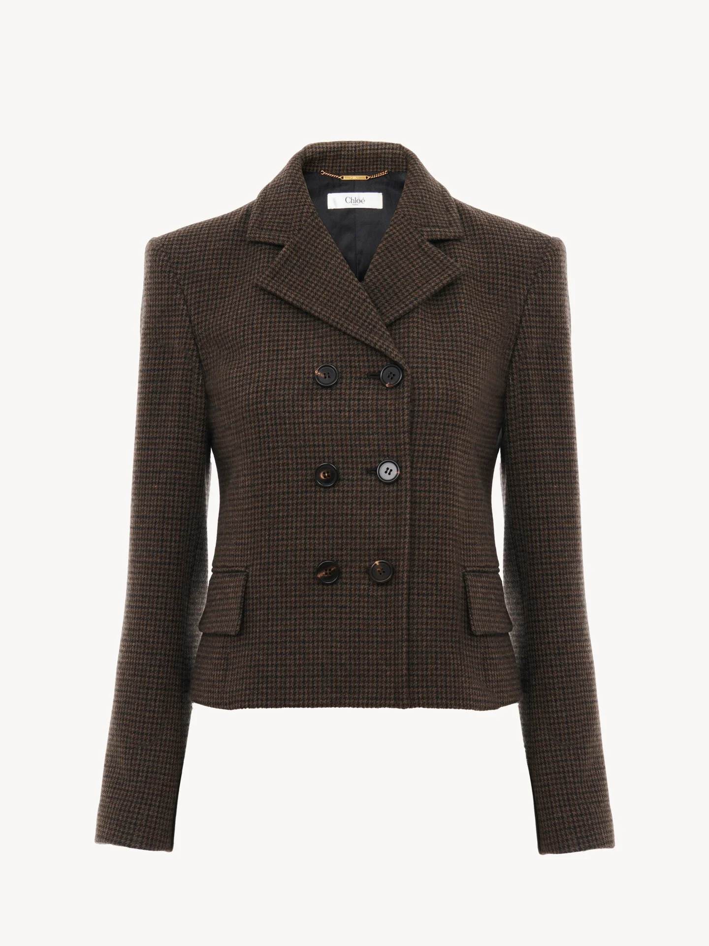 DESCRIPTION Double-breasted fitted jacket in lower-impact mini houndstooth wool with engraved horn buttons and flap pockets. PRODUCT DETAILS Double-breasted fitted jacket outer shell: 100% Virgin wool Lining: 51% Viscose, 49% Cotton Buttons: 100% Water buffalo horn Fit: fitted - The model is 5'10" (178 cm) and wears a prototype in size 36 - Houndstooth wool jacket - Engraved horn buttons at front & cuffs - Front flap pockets The wool used in this product comes from a farm that respects animal welfare, maintains soil health, protects biodiversity and promotes native species. Color: Full Brown Item code: CH25WVE70271227 CARE INSTRUCTIONS To preserve the integrity of your garment, please refrain from washing, entrusting its care to professional cleaning services for optimal maintenance. This garment cannot withstand any bleaching agent. To maintain its shape, gently iron this garment at a maximum sole plate temperature of 110°C, taking care to avoid any harsh pressure while ironing. Entrust this garment to a specialist for mild cleaning with tetrachloroethylene and solvent F, ensuring its delicate nature is maintained with the most care. To maintain its delicate nature, do not wet clean this garment. To best preserve its form and texture, please do not tumble dry this garment. TRACEABILITY Better traceability is central to improving our materials as well as social and environmental practices. Dyeing: Italy Finishing: Italy