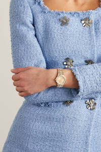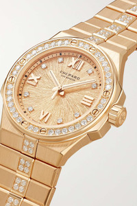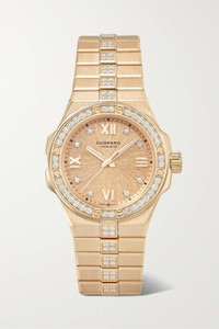 EDITORS'NOTES Chopard's 'Alpine Eagle' watch is a contemporary reinvention of the house's storied 'St. Moritz' style, which was originally created in 1980 by co-President Karl-Friedrich Scheufele. Crafted from 18-karat rose gold, it's set with 1.97-carats of sparkling diamonds and has a galvanized 'Pink Dawn' dial inspired by the bird's iris. It's powered by a Swiss-made 09.01-C calibre movement - the inner workings of which are displayed through the exhibition case back. For warranty information, please refer to details & care SIZE & FIT This item’s measurements are: - Circumference: 18cm / 7.1in DETAILS & CARE - Movement - Swiss-made CHOPARD 09.01-C calibre automatic movement with 42-hour power reserve - 27 jewels, 25,200 Vph Functions - Hour, minute and second hands Dial - 18-karat rose gold dial - 18-karat rose gold hands and Roman numerals, black markers - Diamonds, total weight: 1.97-carats Case - 18-karat rose gold case - Crown for time adjustments and manual winding - Sapphire glass crystal - Exhibition case back Bracelet - 18-karat rose gold bracelet - 18-karat white gold folding-clasp fastening Specifications - Case diameter: 33mm - COSC-certified chronometer - Water resistance: 5 bar - Comes in a presentation box - Reference number: 295384-5002 Your Chopard watch is warranted for a period of (2) years from the date of original purchase from an authorised Chopard dealer