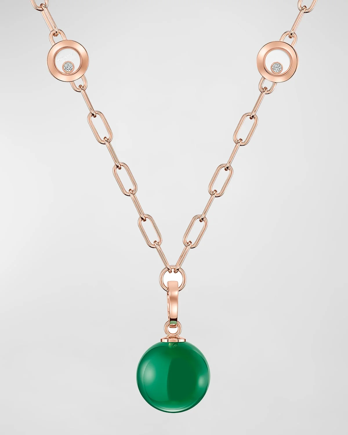 - The Happy Diamonds green agate and diamond pendant is as unique as it is playful. The dancing diamonds are entirely free between two sapphire crystals, thus enabling them to move without restraint, and through this very movement to enhance their inherent sparkle. Little Diamonds Do Great Things. - Chopard necklace with an agate pendant - Approx. 35.4" length (90cm) - 18-karat rose gold with a polished finish - Two see-through windows with free-floating diamonds - Diamond total carat weight: 0.1 - Adjustable length - Lobster clasp - Made in Germany - Care Instructions: - Wash with a non-chemical liquid soap. Rinse piece under water, avoiding any stones. - Chopard Style # 79A619-5101