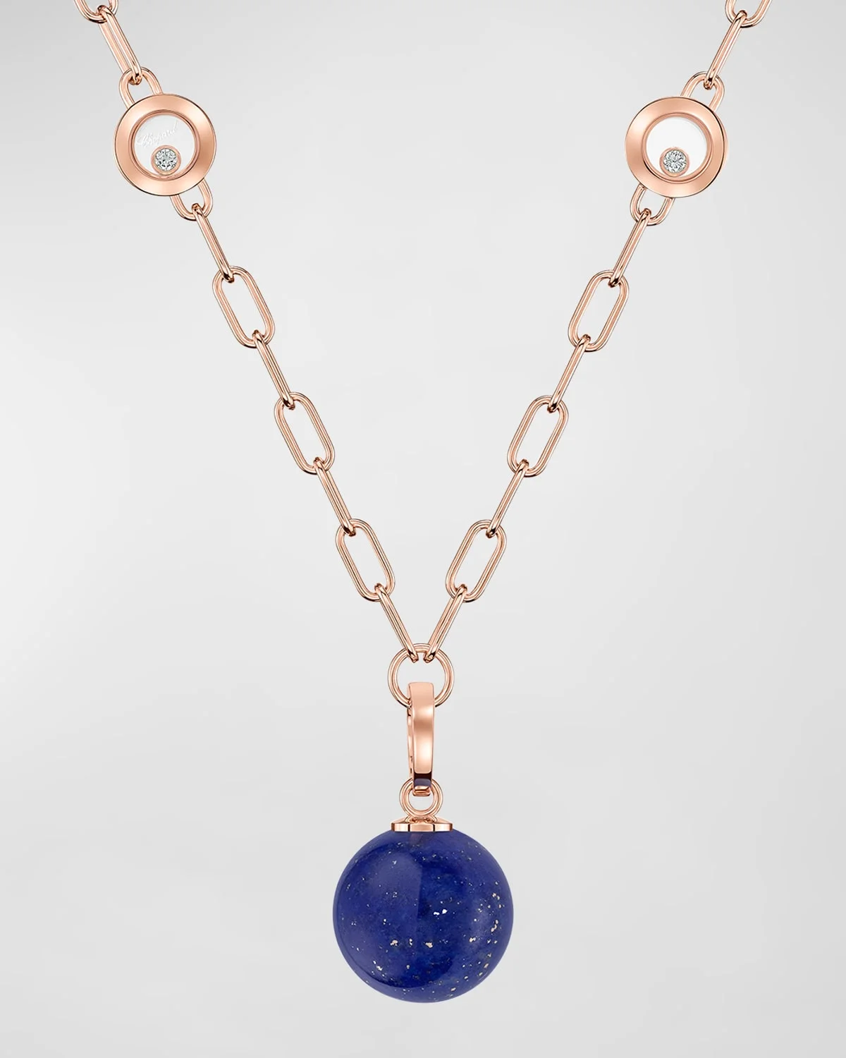 - Chopard necklace with a lapis lazuli pendant - 18-karat rose gold with a polished finish - Two see-through windows with free-floating diamonds - Diamond total carat weight: 0.1 - Adjustable length - Lobster clasp - Made in Germany - Wash with a non-chemical liquid soap. Rinse piece under water, avoiding any stones. Online Inquiries: NMS21_PG364 Store Inquiries: #4613270