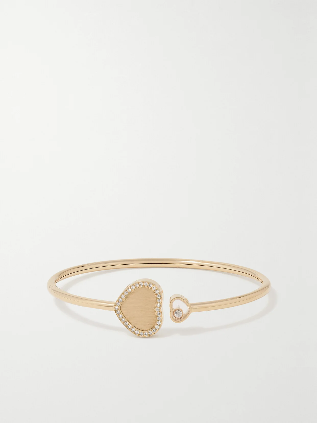 Chopard's 18-karat gold cuff is part of the 'Happy Diamonds' collection, a signature of the house since the '70s. This elegant piece is finished with two heart charms at either end - one is traced with sparkling diamonds, and the other features a single stone that floats freely within a sapphire crystal glass casing.