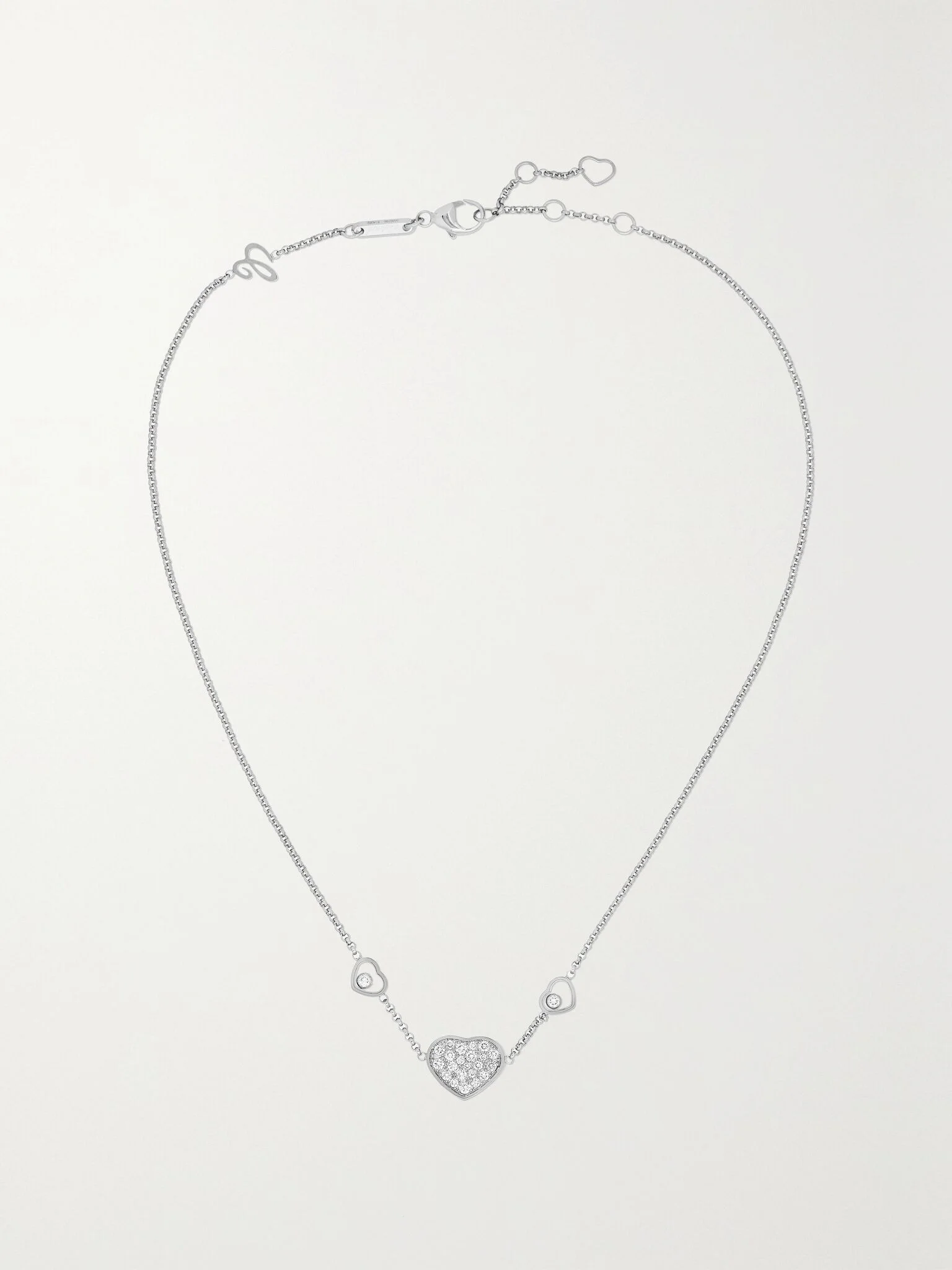 Chopard's 'Happy Hearts' necklace symbolizes love, so it'll make a thoughtful and romantic gift for someone special. It's cast from 18-karat while gold and detailed with charms that beautifully showcase the collection's signature dancing diamonds. Details & Care - Round brilliant-cut F-G IF diamonds, total weight: 0.51-carats - Lobster clasp fastening