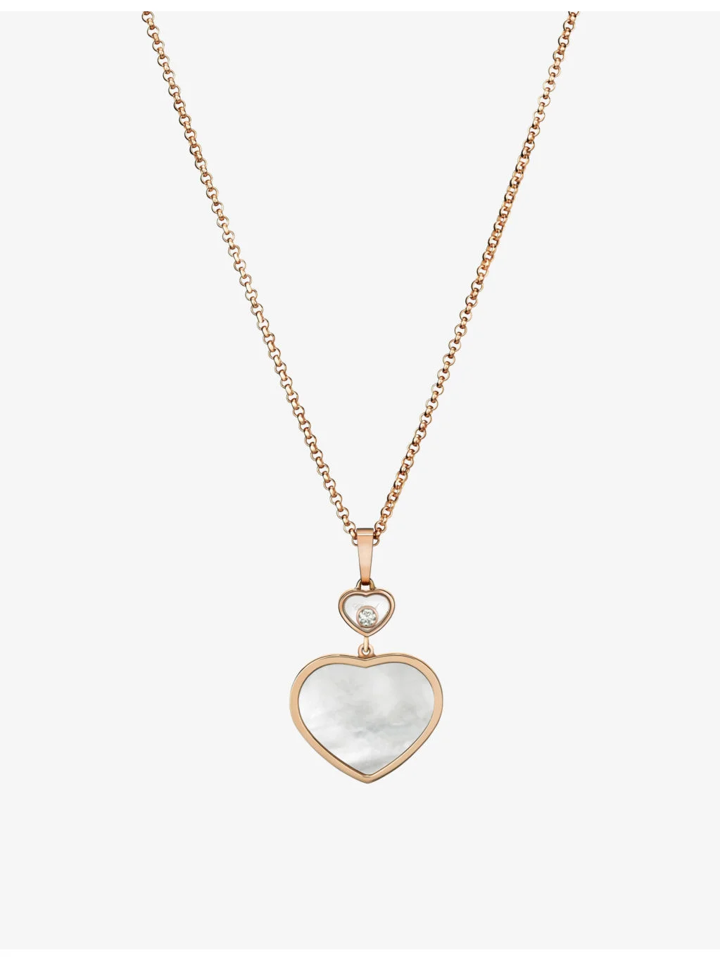 PRODUCT DETAILS - Chopard 18ct rose-gold, 0.05ct diamond and mother-of-pearl pendant - 100% 18ct rose gold - Diamonds, Tahitian mother of pearl - Lobster-clasp fastening - Double-heart design, moving diamond - Carat weight: 0.05ct - Carat cut: round brilliant - Carat clarity: IF - Chain type: cable chain - Chain length: 42-45cm - Made in Switzerland - Wipe with a soft, dry cloth avoid contact with liquids and moisture Ref: R03769926