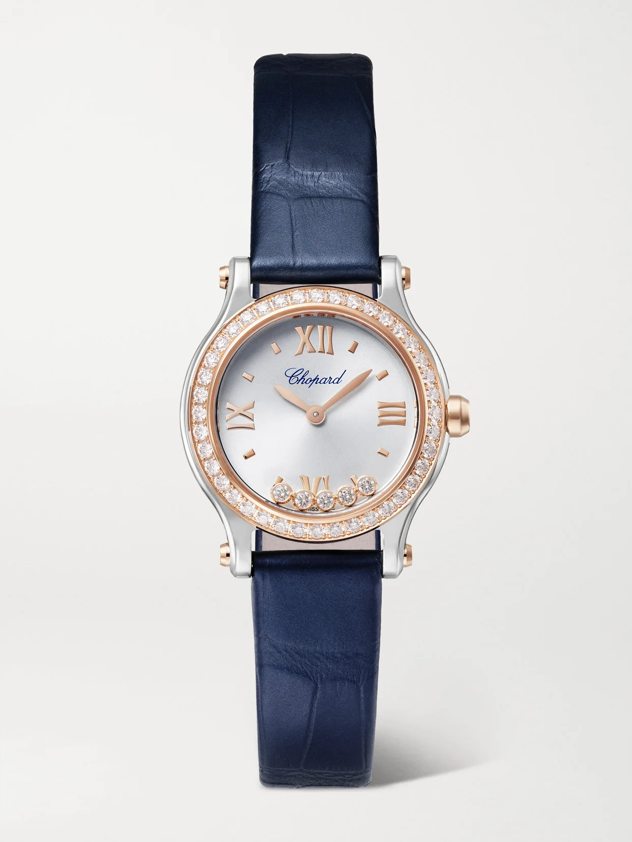 Chopard's 'Happy Sport' watch debuted in 1993 and has seen so many iterations since - while the straps and metal finishes may have changed, the technical finesse and impeccable craftsmanship remain the same. This version is made from stainless steel with 18-karat rose gold accents and has an alligator strap. The satin-brushed sunburst dial is illuminated by a diamond-encrusted bezel while five free-floating gems that move gently within and catch the light with every wave of your hand. For warranty information, please refer to details & care