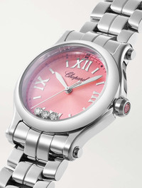 EDITORS'NOTES The diamonds in Chopard's 'Happy Sport' watch are free to dance beneath the sapphire glass crystal - a 'joyfulness' the Maison says is inspired by the feminine spirit. This 30mm iteration is made from stainless steel with a pink sunburst dial and sleek bracelet. It has beautiful, curved edges and will be a truly timeless addition to your watch collection.<br><br><i>For warranty information, please refer to details & care</i> DETAILS & CARE - Movement - Quartz movement - 3 jewels Functions - Hour, minute and second hands Dial - Pink sunburst dial - Stainless steel hands and Roman numerals, black indices and markers Case - Stainless steel case - Diamonds, total weight: 0.08 carats; pink sapphire, total weight: 0.09-carats - Crown for time adjustments and manual winding - Sapphire glass crystal - Engraved case back - Folding clasp-fastening bracelet Specifications - Case diameter: 30mm - Water resistance: 3 bar - Comes in a presentation box - Reference number: 278590-3012 Your Chopard watch is warranted for a period of two (2) years from the date of original purchase from an authorized Chopard dealer.