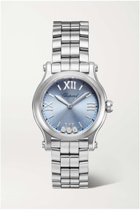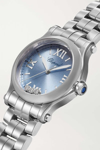EDITORS'NOTES The diamonds in Chopard's 'Happy Sport' watch are free to dance beneath the sapphire glass crystal - a 'joyfulness' the Maison says is inspired by the feminine spirit. This 30mm iteration is made from stainless steel with a complementary light-blue sunburst dial and sleek bracelet. It has beautiful, curved edges and will be a truly timeless addition to your watch collection.<br><br><i>For warranty information, please refer to details & care</i> SIZE & FIT This item’s measurements are: - Circumference: 17cm / 6.7in - Diameter: 2.9cm / 1.1in DETAILS & CARE - Movement - Quartz movement - 7 jewels Functions - Hour, minute and second hands Dial - Light-blue sunburst dial - Stainless steel hands, Roman numerals and indices, dark-blue markers Case - Stainless steel case - Diamonds, total weight: 0.08 carats - Crown for time adjustments and manual winding - Sapphire glass crystal - Engraved case back - Folding clasp-fastening bracelet Specifications - Case diameter: 30mm - Water resistance: 3 bar - Comes in a presentation box - Reference number: 278590-3010 Your Chopard watch is warranted for a period of (2) years from the date of original purchase from an authorized Chopard dealer.