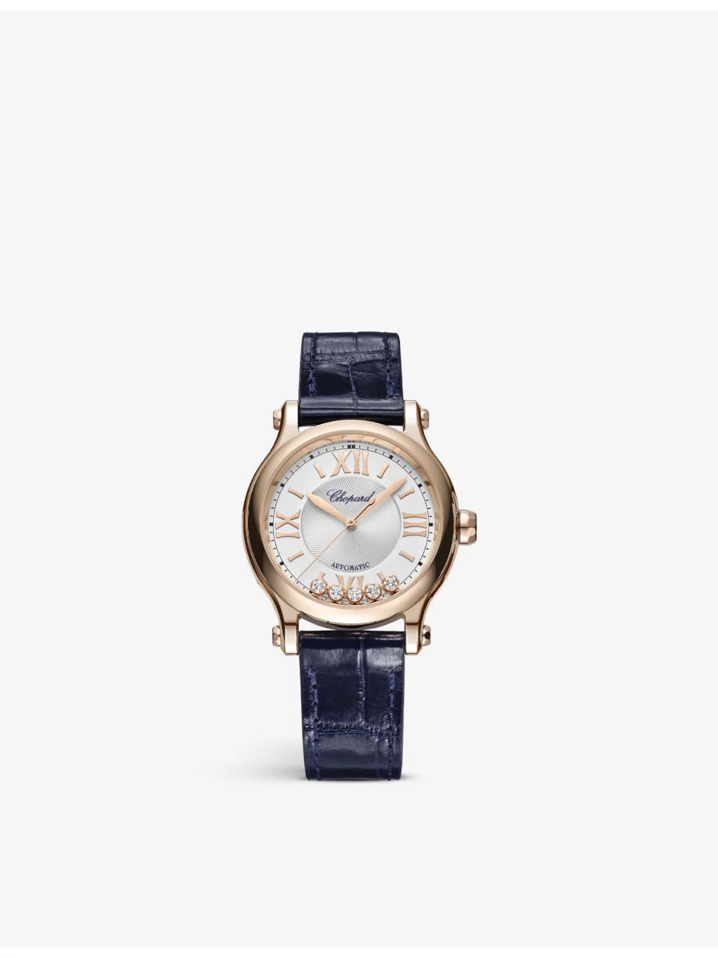 PRODUCT DETAILS - Chopard 18ct rose-gold and diamond automatic watch - 18-carat rose gold - 5 diamonds - Style number: 275378-5001 - Clasp fastening - Clasp fastening - Carat weight: 0.25ct - Carat clarity: IF - Carat shape: round - Carat cut: full cut - Round case, diamond settings on dial, 27 jewels, three hands, Roman numerals, 42-hour power reserve, logo-embossed, sapphire crystal, 18-carat rose-gold crown, automatic movement, alligator-embossed leather strap - Case diameter: 33mm - Case width: 10.95mm - Wipe with a clean, dry cloth - Water resistance: 3 bar / 3 atm / 30m / 100ft - Made in Switzerland - Two-year manufacturer's warranty - To learn more about this product or for expert styling services, get in touch with our Personal Shopping team Ref: R03769924