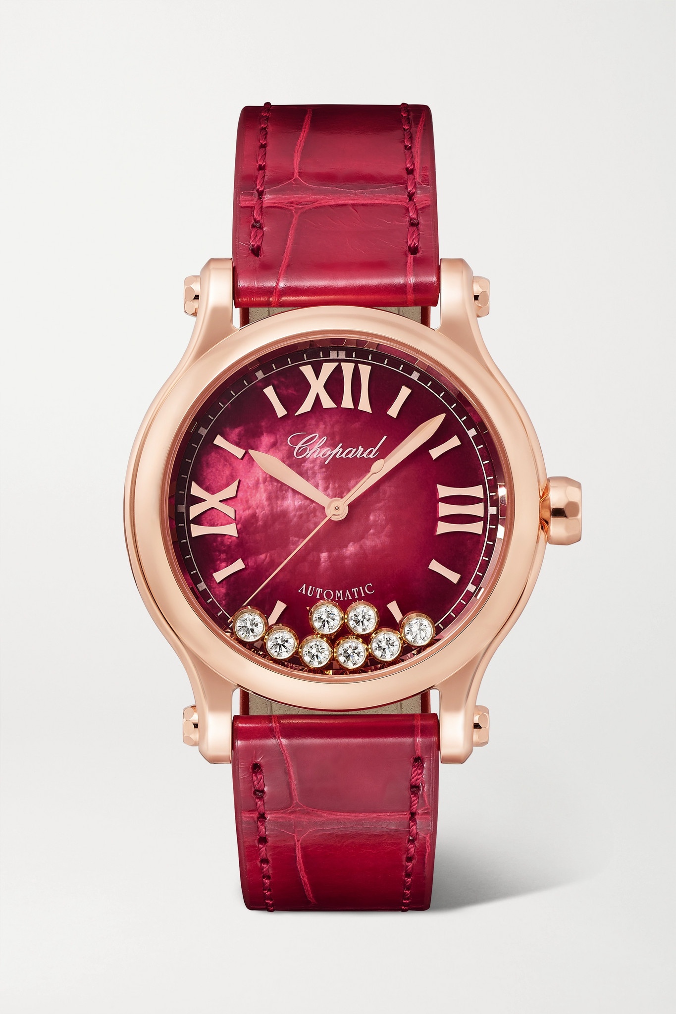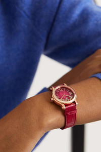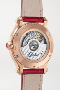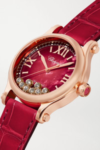 EDITORS'NOTES Chopard's signature 'Happy Sport' collection debuted in 1993 and with each passing year, the technical finesse and creative design have further established it as an iconic style. This 18-karat rose gold iteration features eight free-moving diamonds that dance across the red mother-of-pearl dial like water droplets on glass. It's fitted with an adjustable patent alligator strap and turns to reveal hints of the inner workings through the sapphire crystal case back. SIZE & FIT This item’s measurements are: - Length: 21cm / 8.3in - Circumference: 19cm / 7.5in DETAILS & CARE - Movement - CHOPARD 09.01-C calibre automatic movement with 42-hour power reserve - 27 jewels Functions - Hour, minute and second hands Dial - Red mother-of-pearl dial - 18-karat rose gold hands, Roman numerals and indices, white markers Case - 18-karat rose gold - Diamonds, total weight: 0.40-carats; ruby, total weight: 0.13-carats - Crown for time adjustments and manual winding - Sapphire glass crystal - Exhibition case back - Pin buckle-fastening red alligator strap Specifications - Case diameter: 33mm - Water resistance: 3 bar - Comes in a presentation box - Alligator: USA - Mother-of-pearl: Australia - Reference number: 275378-5005 - Manufactured in Switzerland