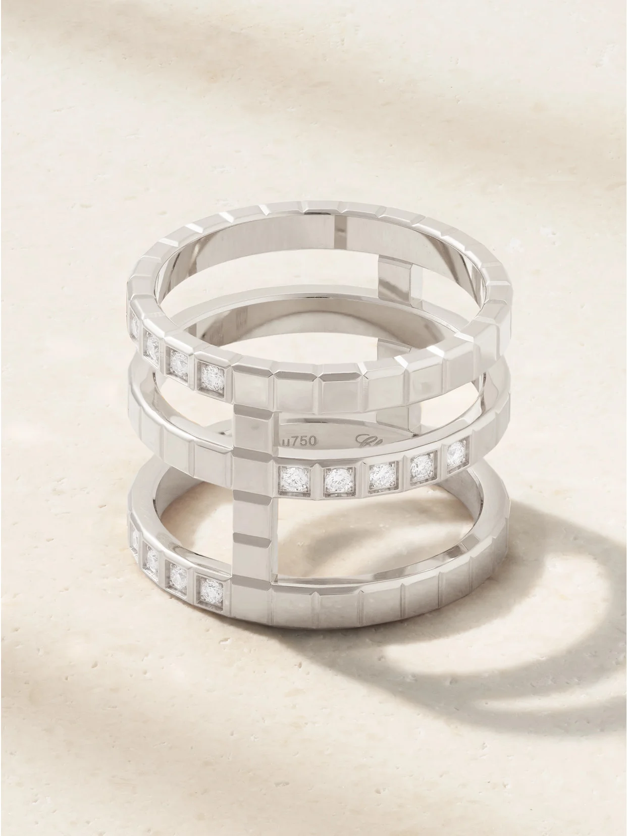 Chopard's signature 'Ice Cube' collection celebrates the "perfection and miraculous geometry" of its namesake. Handmade from 18-karat white gold, this ring has a triple-band design traced with 0.04-carats of diamonds that shimmer as they catch light. Wear yours with other pieces from the label.
