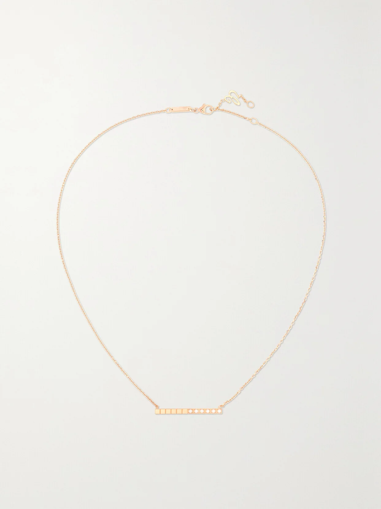Part of Chopard's 'Ice Cube' collection, this 'Pure' necklace is cast from 18-karat rose gold. It's strung on a fine chain and centered with a row of diamond-encrusted blocks that symbolize geometry and perfection. Mix and match yours with similar styles.