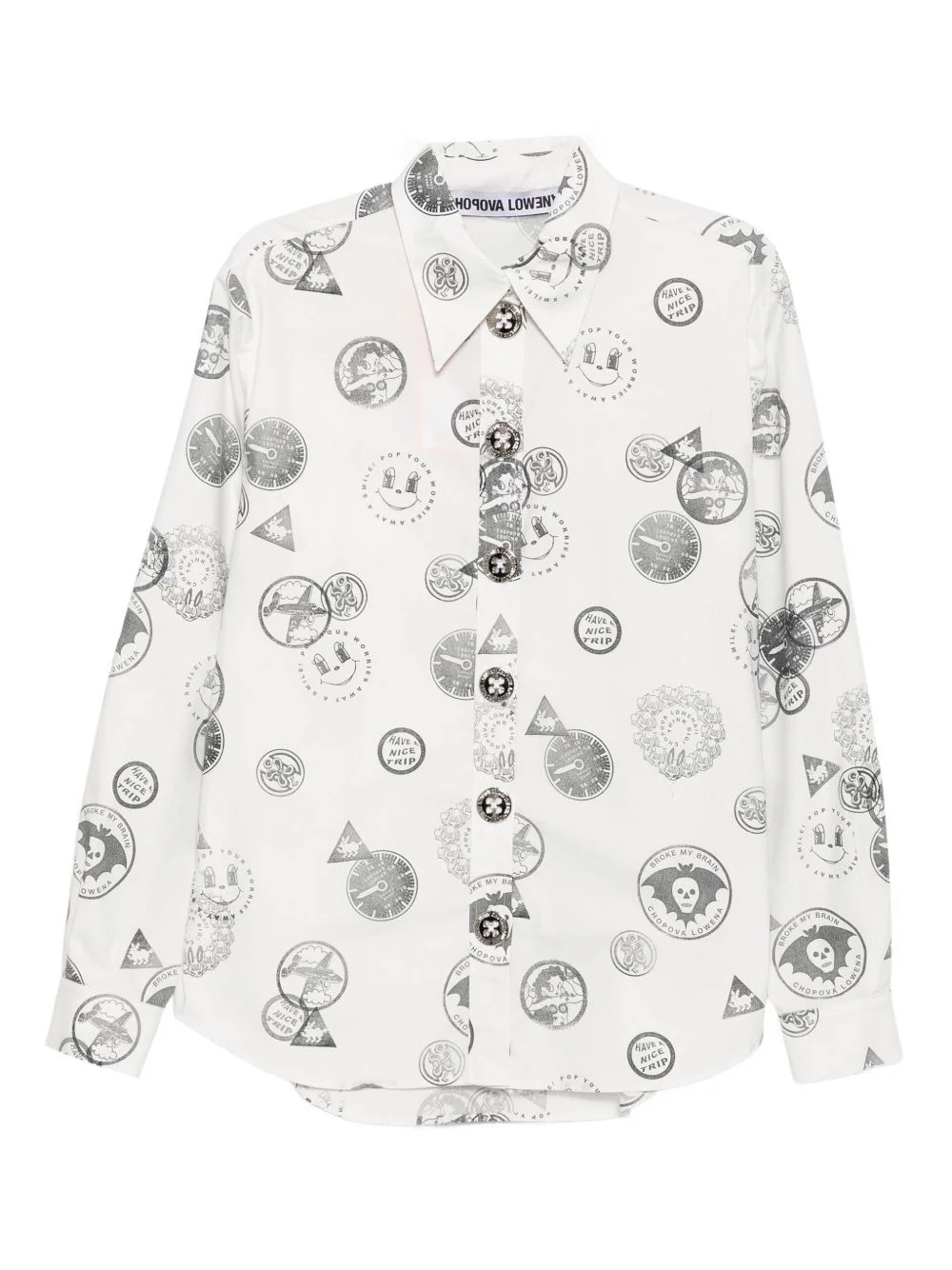 all-over print cotton shirt Highlights - White - Front button fastening - Long sleeves - Buttoned cuffs Imported Composition Organic Cotton 100% SIZE & FIT Model measurements Height 5 ft 10 in(1.77 m) Bust/Chest 30.31 in(77 cm) Hips 34.25 in(87 cm) Waist 25.19 in(64 cm) FittingInformation Designed to be unstructured, offering a loose fit throughout Made from a midweight non-stretch fabric, this piece offers minimal elasticity when worn Washing instructions Dry Clean Only