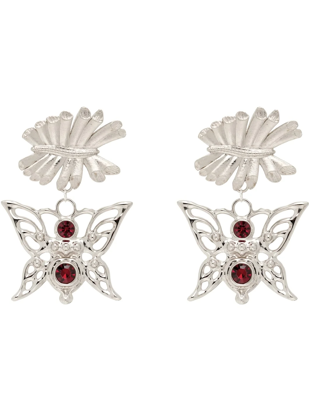 Pair of drop earrings in palladium-plated brass. · Graphic at face · Graphic with crystals in red at drop · Post-stud fastening · H2.75" x W1.75" Supplier color: Silver Palladium-plated brass, crystal. Made in Bulgaria 252529F022007