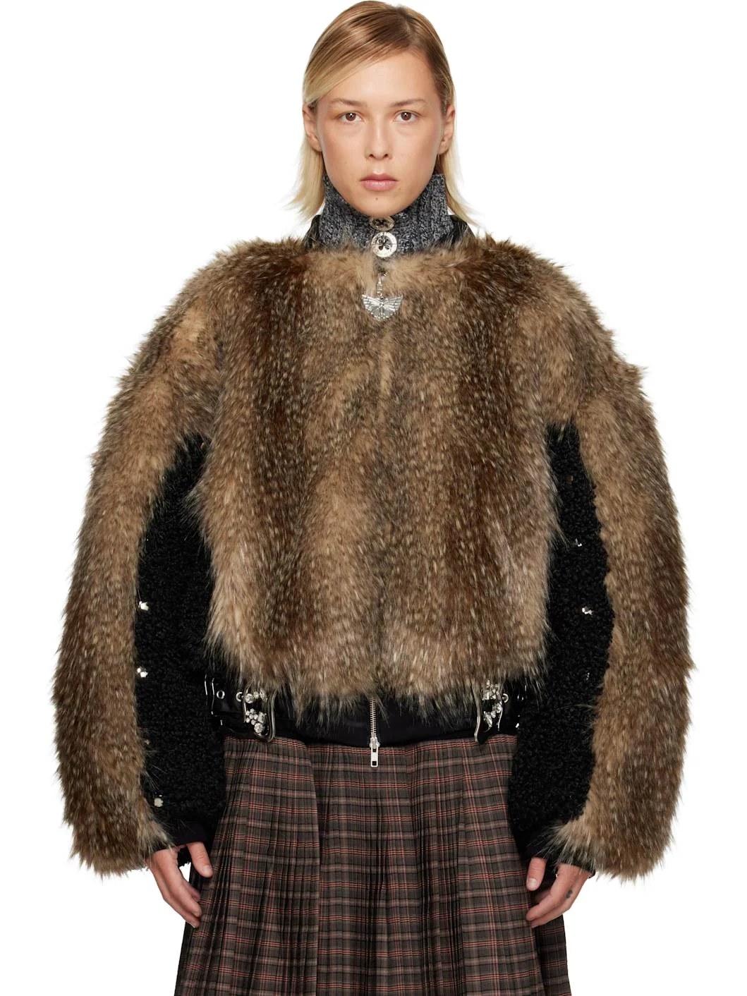 Faux-fur and boucle bomber jacket. · Knit stand collar and cuffs · Charms at two-way zip closure · Zip pockets with charms and chain detailing at front · Pin-buckle straps with crystals at elasticized hem · Studs at sleeves · Full satin lining Supplier color: Brown/Black Body 1: 100% seaquall. Body 2: 100% polyester. Trim: 100% cotton. Lining: 100% acetate. Made in Bulgaria 252529F058001