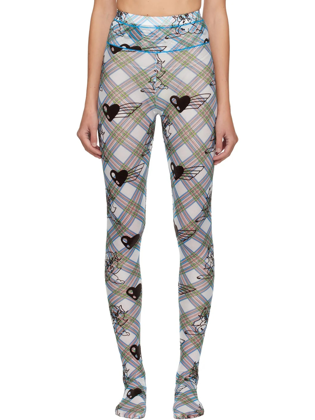 Sheer stretch nylon mesh leggings. · Check pattern and flocked graphic pattern throughout · Elasticized waistband · Integrated feet Supplier color: Multi Body: 94% recycled nylon, 6% spandex. Trim: 100% polyester. Made in Bulgaria 252529F085001
