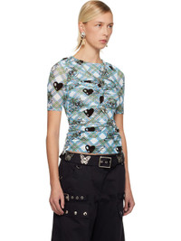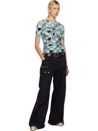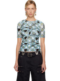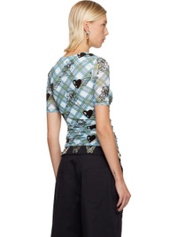 Semi-sheer stretch recycled nylon mesh T-shirt. · Check pattern and flocked graphic pattern throughout · Crewneck · Chain detailing at front · Charms at front and side seams · Ruching at side seams · Gathering at cap sleeves Supplier color: Blue multi Body: 94% recycled nylon, 6% spandex. Trim: 100% polyester. Made in Bulgaria 252529F110016