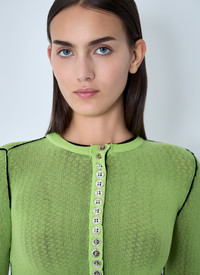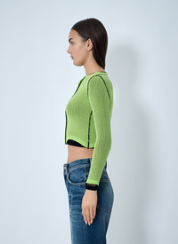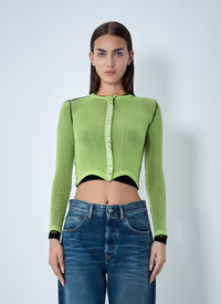 Fishnet cardigan with a layered sheer knit construction. - Crewneck - Front button fastening - Long sleeves - Ribbed trims - 17% Elastane, 83% Nylon, 70% Viscose, 30% Polyester - Color: Yellow - Code: 5263