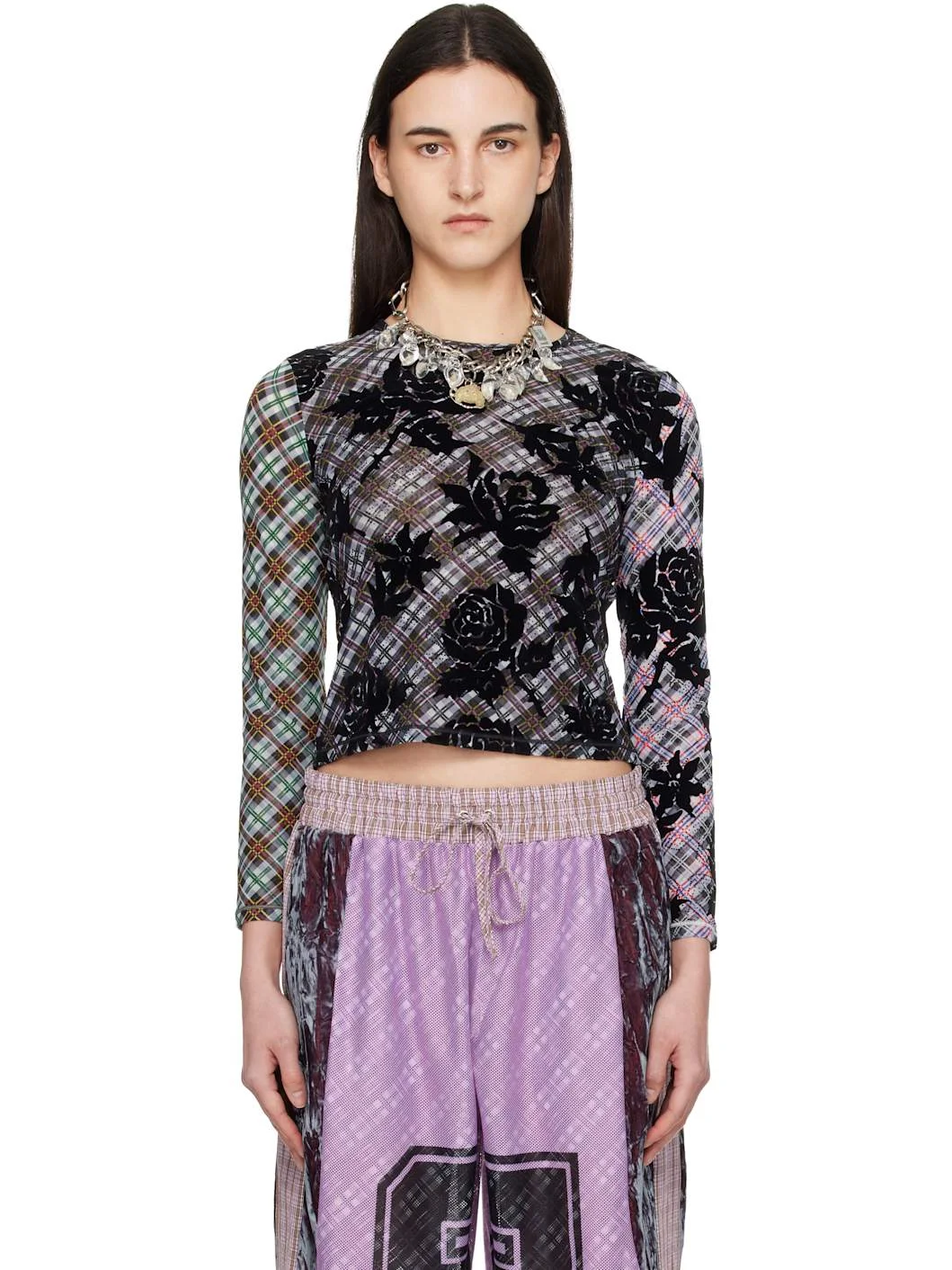 Layered stretch recycled polyester mesh top. · Plaid pattern printed and floral pattern flocked throughout · Crewneck Supplier color: Multi Body 1: 95% recycled polyester, 5% elastane. Body 2: 100% polyester. Made in Bulgaria 261529F110007