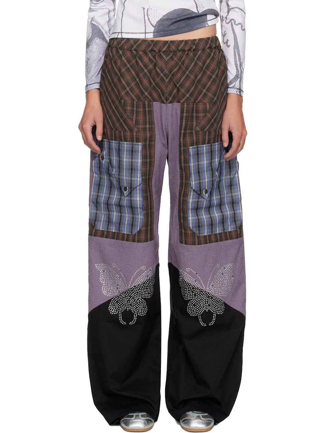 Cotton- and linen-blend flannel trousers. · Check pattern throughout · Paneled construction · Loose-fit · Elasticized waistband · Flap pockets at front · Crystal-cut graphic at knees Supplier color: Multi Body 1: 72% cotton, 28% linen. Body 2: 99% cotton, 1% elastane. Trim 1: 62% cotton, 38% polyamide. Trim 2: 100% cotton. Made in Bulgaria 252529F087001