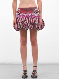A red tartan mini skirt with pink lace and a gathered taffeta bubble silhouette. Gem buckles complete the playful slim fit. Featuring: • Slim fit • Red tartan with pink lace • Gathered taffeta bubble construction • Gem buckles • Mini-length • Made in Bulgaria • Main 1: 100% Cotton | Main 2: 100% Polyester | Main 3: 92% Nylon 8% Rayon | Lining: 100% Nylon • Standard sizing Model is 5'7" wearing size S. Bust: 32" Waist: 25" Hips: 34"