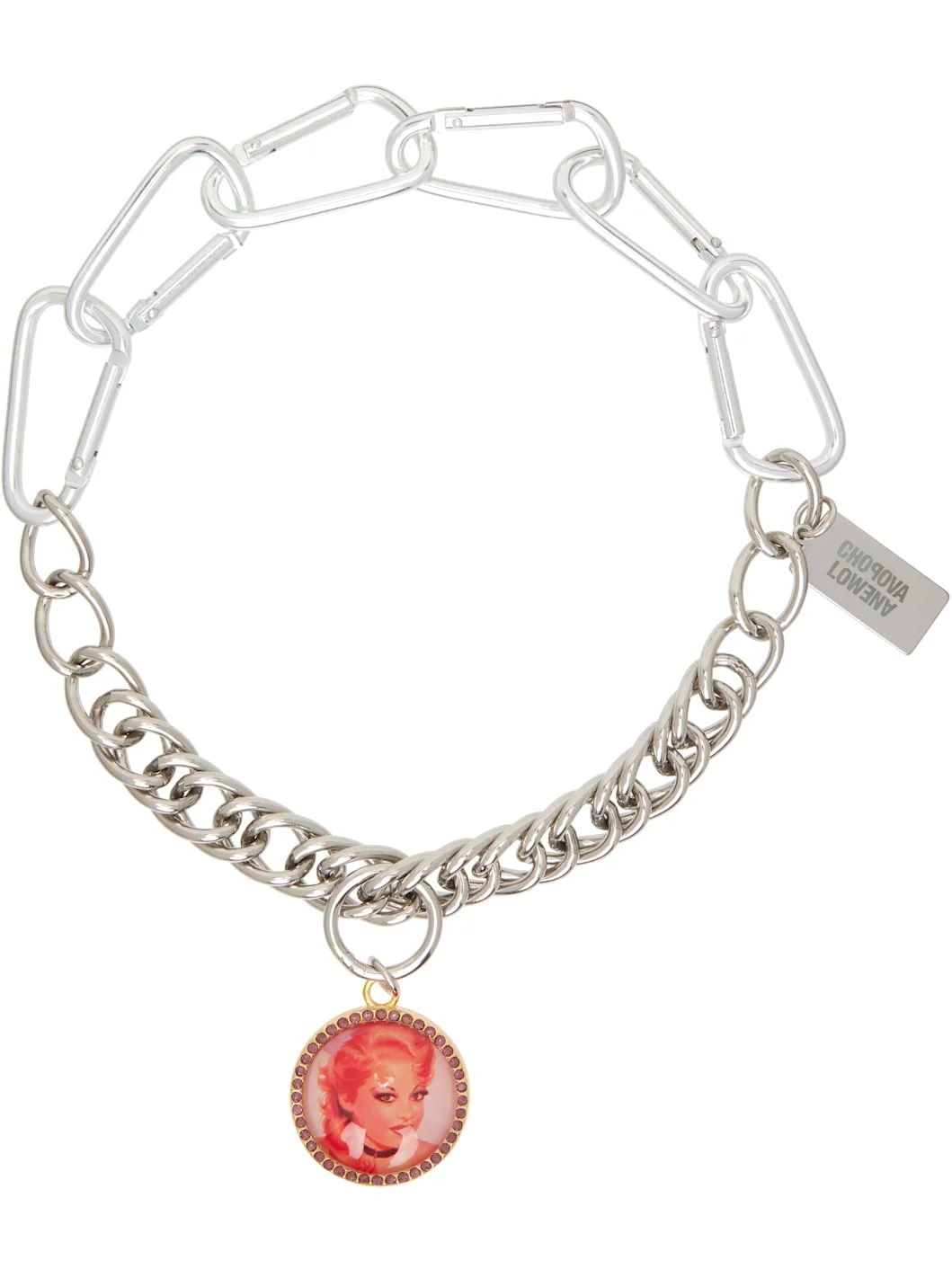 Curb chain necklace in palladium-plated brass. · Graphic charms with crystals at length · Stainless steel carabiner fastenings · L18" Supplier color: Multi Palladium-plated brass, stainless steel, crystal, zinc, acrylic. Made in Bulgaria 252529F023002