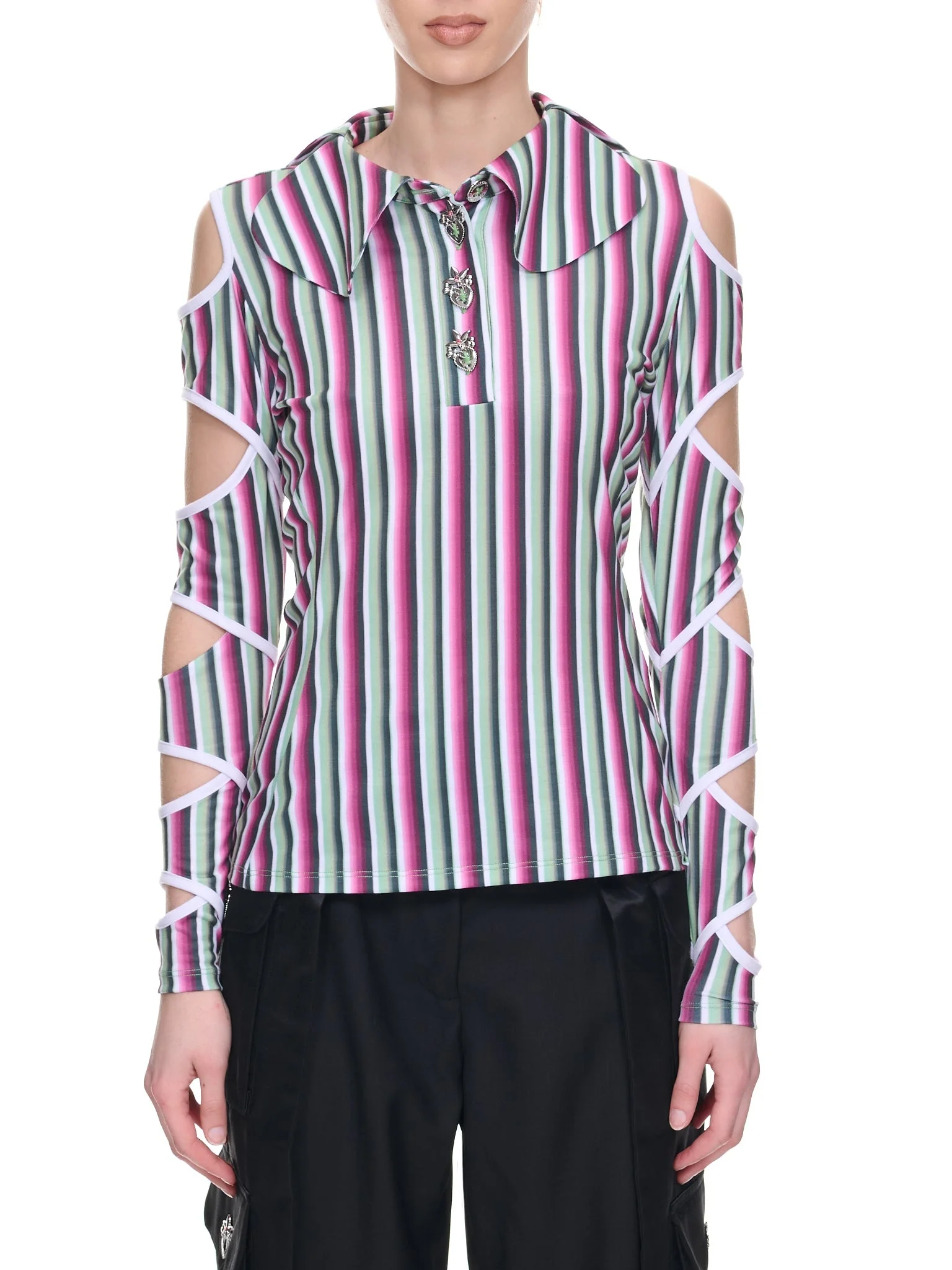 CHOPOVA LOWENA shirt in multicolor, paneled design, stretch jersey, organic cotton poplin, stripe pattern, modified peter pan collar, logo engraved graphic button closure, sleeve cut-outs, silver-tone hardware, slim fit. Made in Bulgaria Standard Sizing Body - 96% Polyester, 4% Elastane Second - 100% Organic Cotton Model is 5'10" wearing size S. Bust: 28.5" Waist: 22" Hip: 34.5"