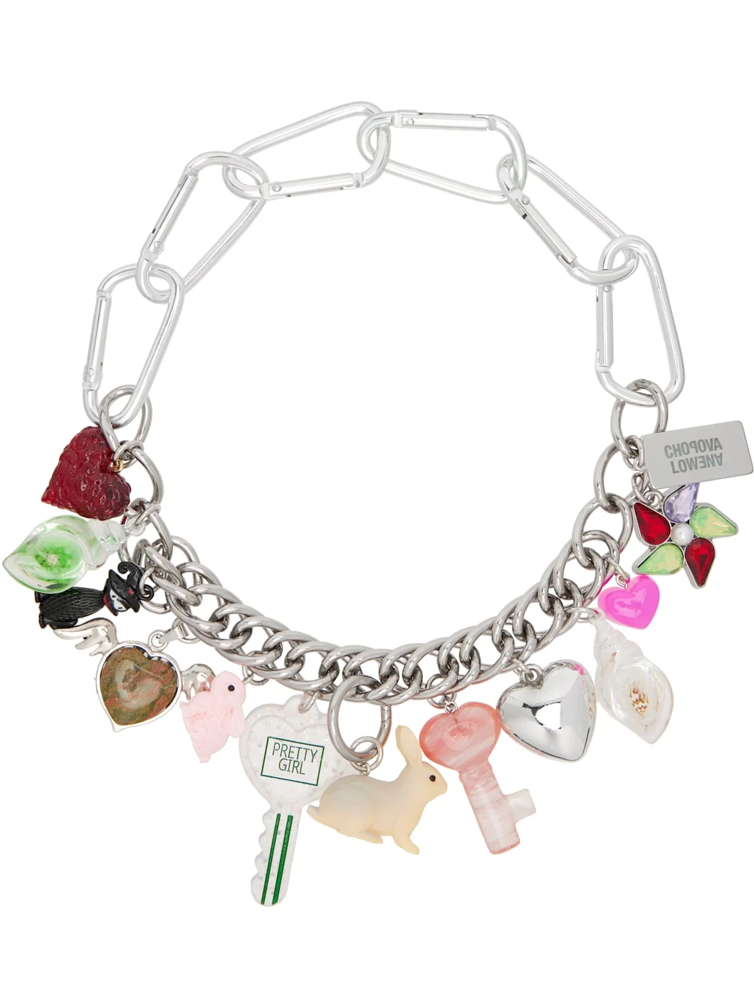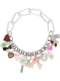 Curb chain necklace in palladium-plated brass. · Graphic charms and logo plaque at length · Stainless steel carabiner fastenings · L18" Supplier color: Silver Palladium-plated brass, stainless steel, acrylic. Made in Bulgaria 252529F023001