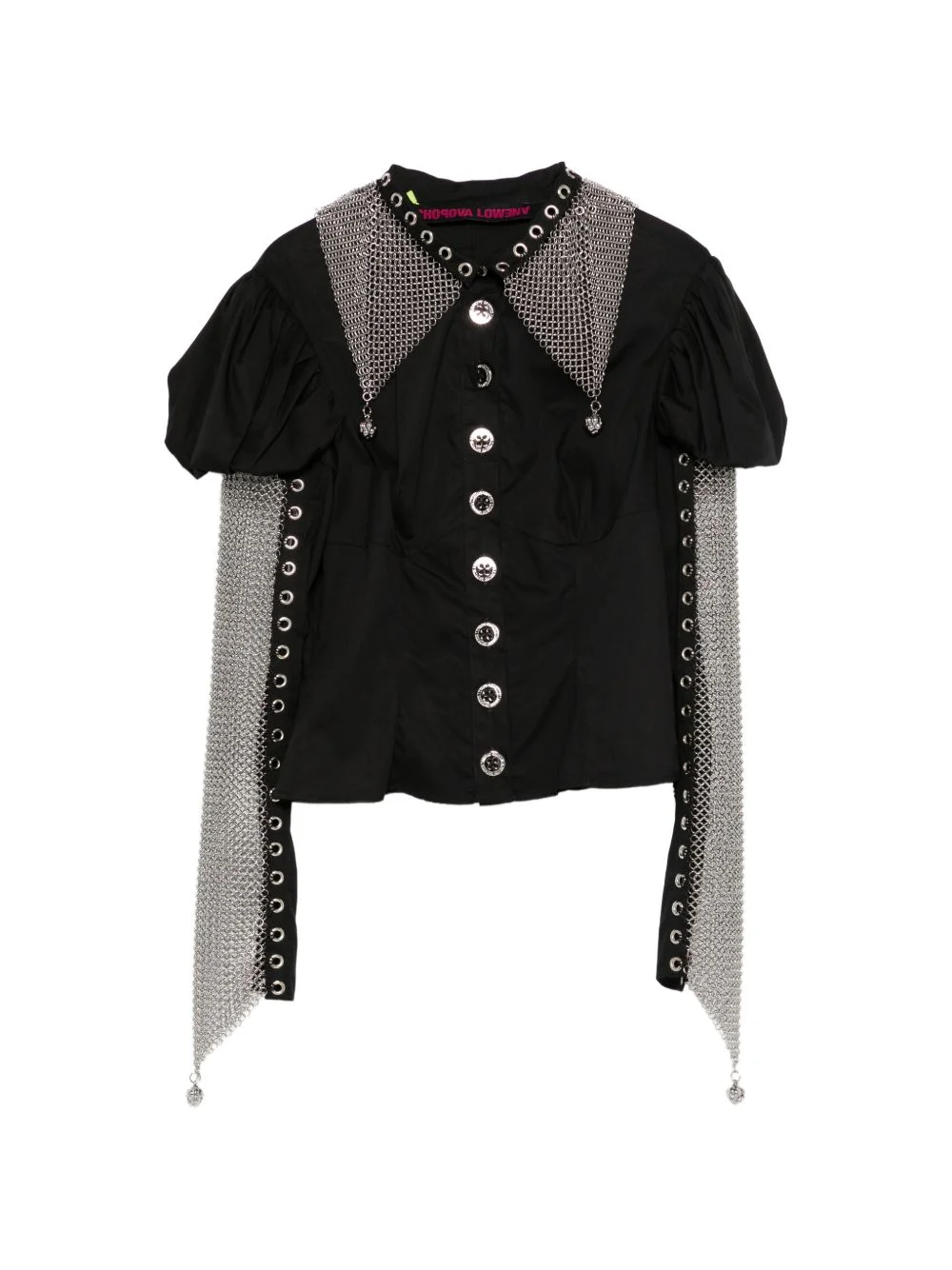 Titan chain buttoned shirt Highlights - Black - Silver-tone chain embellishment - Front button fastening - Point collar - Short puff sleeves - Draped chain detail Imported Composition Cotton 100%, stainless steel 100% Washing instructions Dry Clean Only
