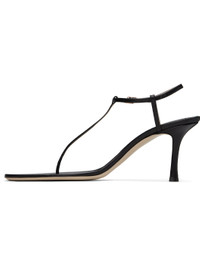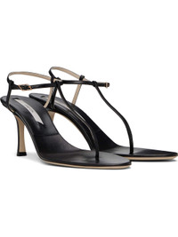 Grained lambskin heeled sandals in black. · Open almond toe · Thong-style strap · Pin-buckle ankle strap · Logo patch at footbed · Covered stiletto heel with rubber injection · Grained calfskin sole · Heel: H3.25" Supplier color: Black Upper: lambskin. Sole: calfskin, rubber. Made in France 252382F125005