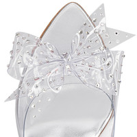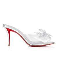 The Aqua Strass pump is packed with signature Maison Christian Louboutin details. Set on an 80 mm stiletto heel, it is entirely crafted in silver laminated leather. This open-toe style features a wide strap with a PVC bow, adorned with hand-placed strass. A sophisticated pump, designed for special occasions. Product information Material: PVC Color: Silver Reference: 1240792S339 Heel height: 80 mm Collection: Summer 24