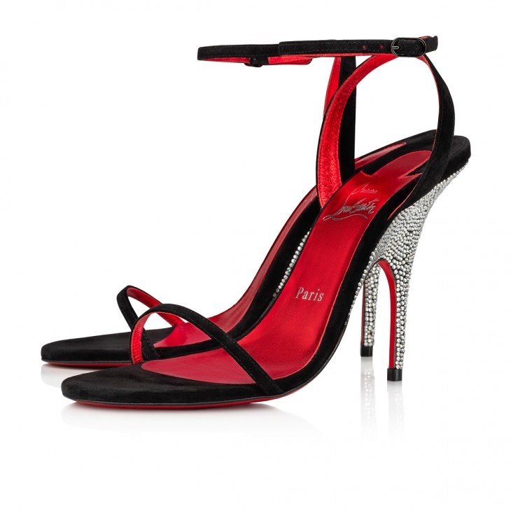 The Arch Queen sandal showcases Maison Christian Louboutin's expertise. Crafted in black veau velours, this model has a slender strap with a buckle that shows off the ankle. It sits atop a 100 mm heel adorned with silver strass for a shimmering effect. Product information Material: Veau velours Color: Black Reference: 1230652J666 Heel height: 100 mm Collection: Summer 23