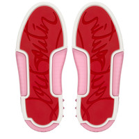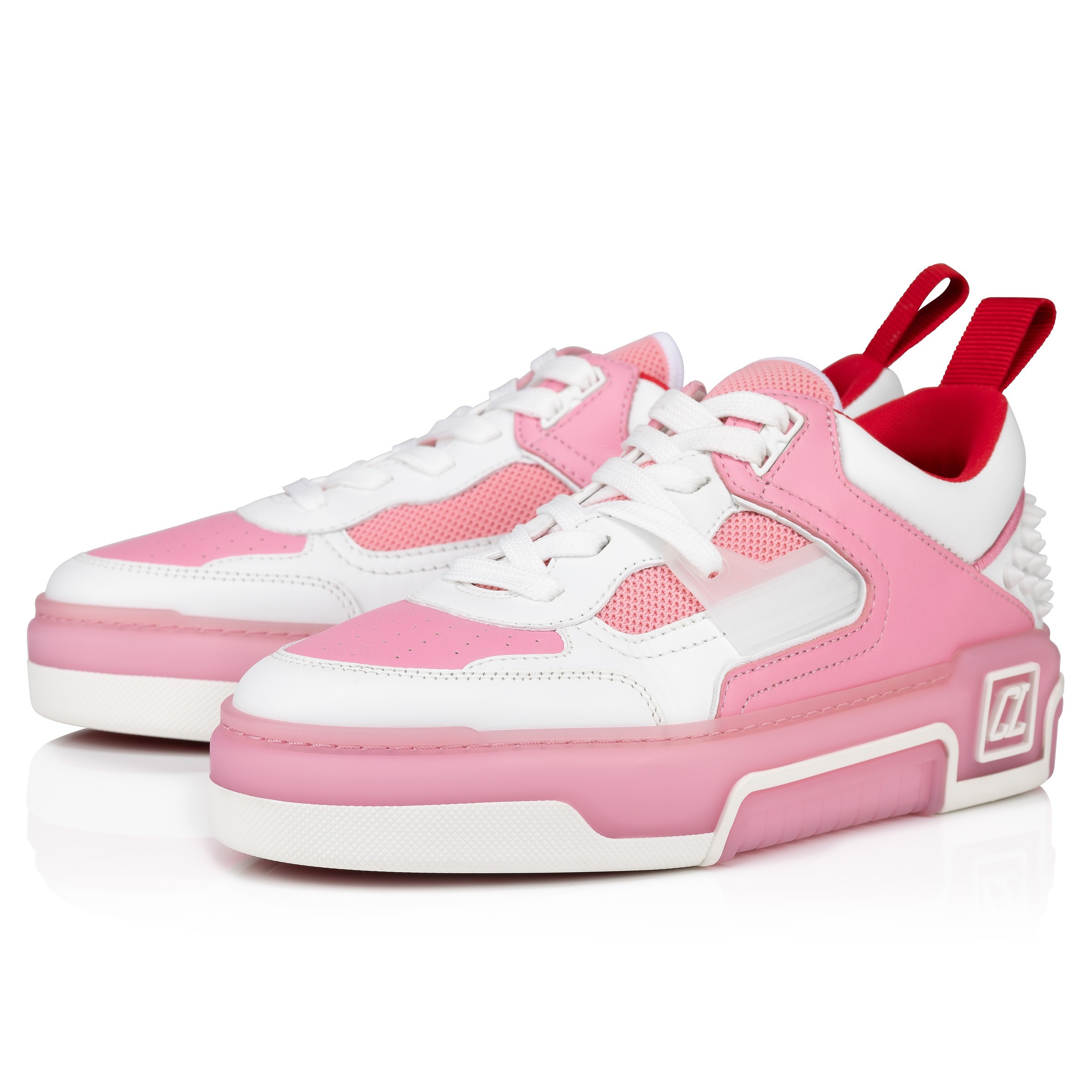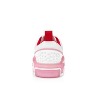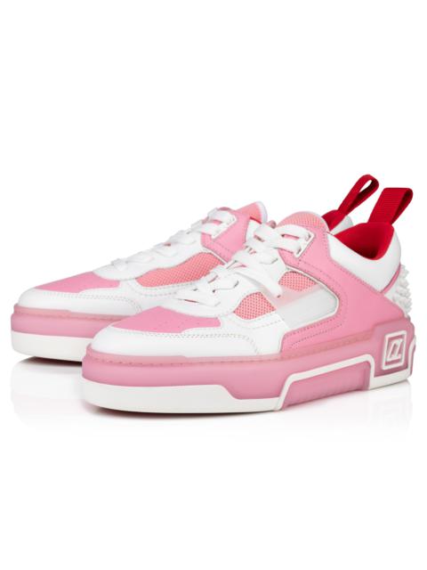 Showcasing an array of Maison Christian Louboutin signature details, the Astroloubi for women is inspired by the basketball sneakers of the 90s. This sophisticated style blends white calf leather with Calipso pink nappa leather. A lightweight, sporty design, this model is finished with a Loubi red heel tab. It features spikes at the back and a CL varsity monogram on the side. Product information Material: Calf leather Color: Calipso Reference: 32403896261 Collection: Fall Winter 24