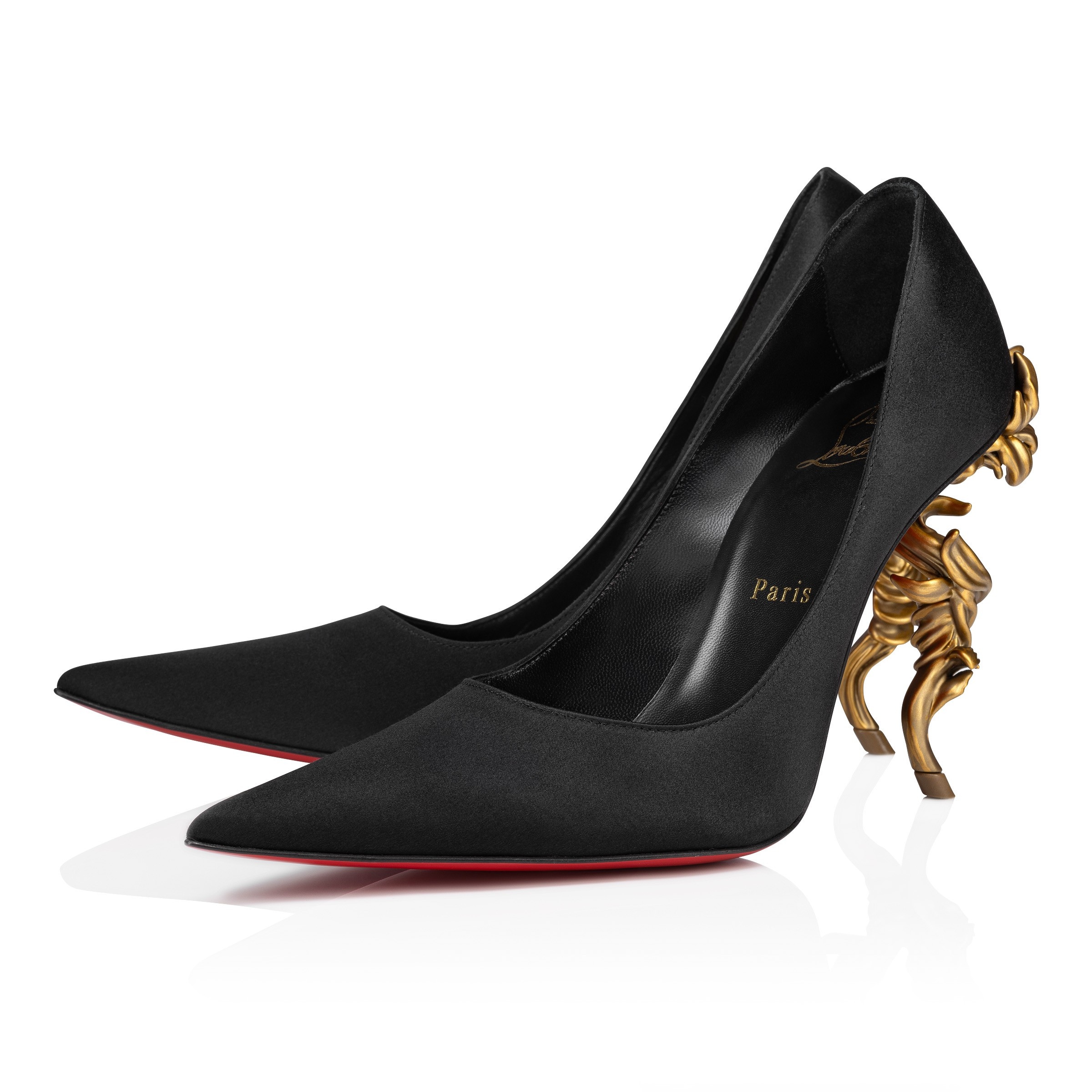 The Bellarose brings a bold, modern twist. Featuring a showstopping 100 mm 'chandelier' heel that descends to a sophisticated pointed toe, this shoe will make heads turn. Modeled on the iconic Kate pump and created in black crepe satin and lurex, the signature Maison Christian Louboutin Loubi red sole completes the story. Product information Reference: 1250274B439 Color: Black Material: Crepe satin Heel Height: 100 mm