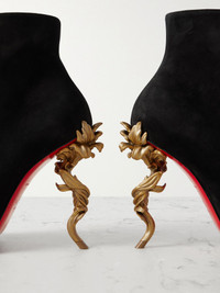 Christian Louboutin's 'Belle' boots are set on gold-tone heels that are carved to look like lush vines. They're made from suede and have sharp pointed toes modeled on the brand's signature 'Kate' styles. Show yours off with midi dresses or cropped jeans. Size & Fit - Fits true to size, take your normal size - Only available in full sizes, go up to the nearest whole size if you take a half size - Italian sizing Details & Care - Heel measures approximately 100mm/ 4 inches - Black suede - Zip fastening along side